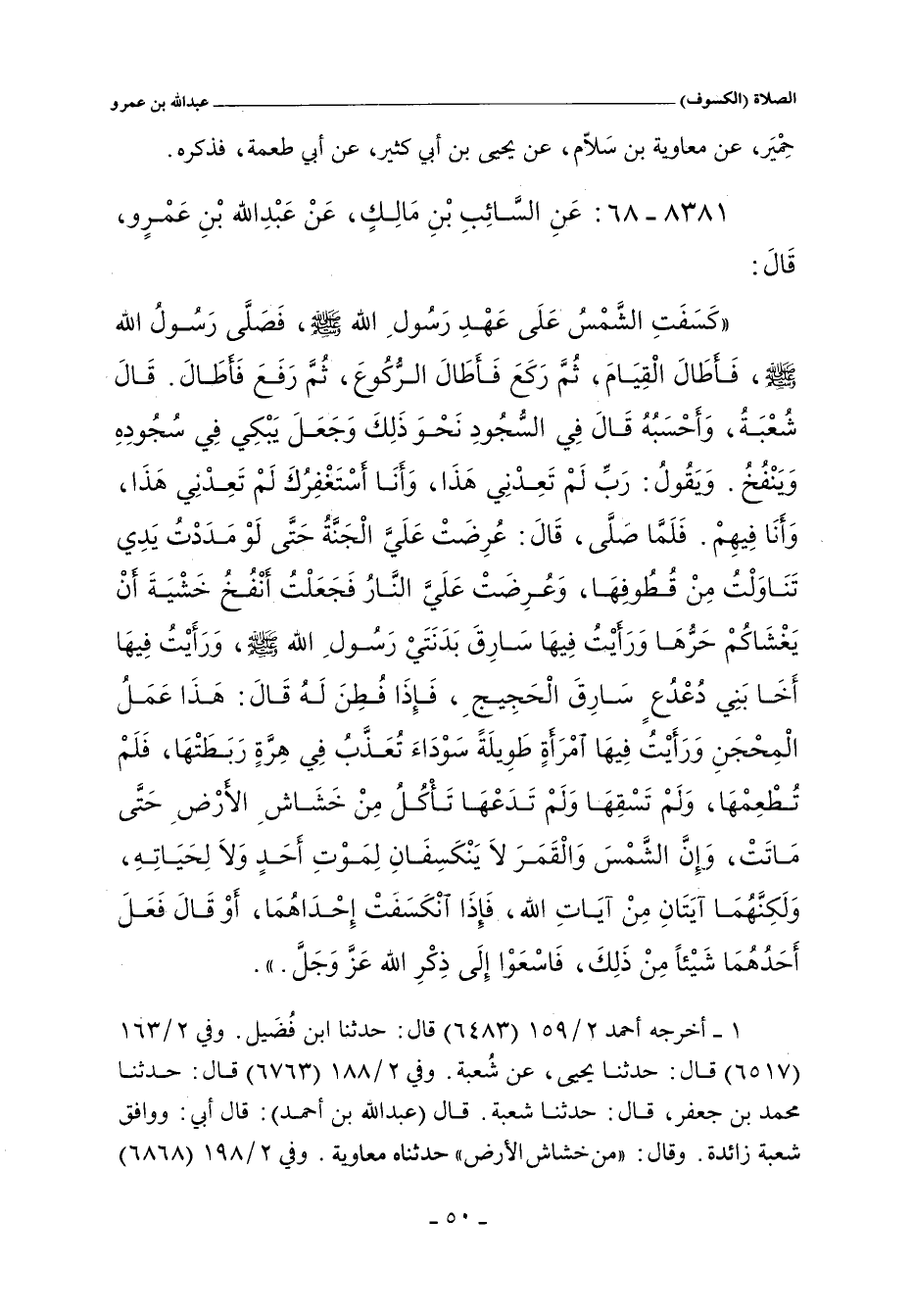 كَسَفَتِ الشَّمْسُ عَلَى عَهْدِ رَسُولِ اللهِ صلى الله عليه وسلم، فَصَلَّى رَسُولُ اللهِ صلى الله عليه وسلم، فَأطَالَ الْقِيَامَ، ثُمَّ رَكَعَ فَأطَالَ الرُّكُوعَ، ثُمَّ رَفَعَ فَأَطَالَ. قَالَ شُعبة ُ، وَأحْسَبُهُ قَالَ فِي السُّجُودِ نَحْوَ ذَلِكَ، وَجَعَلَ يَبْكِي فِي سُجُودِهِ وَيَنْفُخُ، وَيَقُولُ: رَبِّ لَمْ تَعِدْنِي هَذَا، وَأَنَا أَسْتَغْفِرُكَ. لَمْ تَعِدْنِي هَذَا، وَأَناَ فِيهِمْ. فَلَمَّا صَلَّى، قَالَ: عُرِضَتْ عَلَيَّ الْجَنَّةُ حَتَّى لَوْ مَدَدْتُ يَدِي تَنَاوَلْتُ مِنْ قُطُوفِهَا، وَعُرِضَتْ عَلَيَّ النَّارُ فَجَعَلْتُ أَنْفُخُ خَشْيَةَ أَنْ يَغْشَاكُمْ حَرُّهَا، وَرَأَيْتُ فِيهَا سَارِقَ بَدَنَتَيْ رَسُولِ الله صلى الله عليه وسلم، وَرَأَيْتُ فِيهَا أخَا بَنِي دُعْدُعٍ سَارِقَ الْحَجِيجِ، فَإِذَا فُطِنَ لَهُ قَالَ: هَذَا عَمَلُ الْمِحْجَنِ، وَرَأَيْتُ فِيهَا امْرَأَةً طَوِيلَةً سَوْدَاءَ تُعَذَّبُ فِي هِرِّةٍ رَبَطَتْهَا، فَلَمْ تُطْعِمْهَا، وَلَمْ تَسْقِهَا، وَلَمْ تَدَعْهَا تَأْكُلُ مِنْ خَشَاشِ الأَرْضِ حَتَّى مَاتَتْ، وَإِنَّ الشَمْسَ وَالْقَمَرَ لَا يَنْكَسِفَانِ لِمَوْتِ أَحَدٍ وَلَا لِحَيَاتِهِ، وَلَكِنَّهُمَا آيَتَانِ مِنْ آيَاتِ الله، فَإِذَا انْكَسَفتْ إِحْدَاهُمَا، أَوْ قَال: فَعَلَ أَحَدُهُمَا شَيْئًا مِنْ ذَلِكَ، فَاسْعَوْا إِلَى ذِكْرِ الله عَزَّ وَجَلَّ.