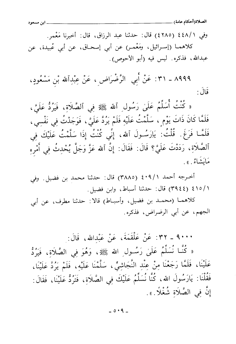 كُنَّا نُسَلِّمُ عَلَى رَسُولِ اللهِ صلى الله عليه وسلم، وَهُوَ فِي الصَّلَاةِ، فَيَرُدُّ عَلَيْنَا، فَلَمَّا رَجَعْنَا مِنْ عِنْدِ النَّجَاشِيِّ، سَلَّمْنَا عَلَيْهِ، فَلَمْ يَرُدَّ عَلَيْنَا، فَقُلْنَا: يَارَسُولَ اللهِ، كُنَّا نُسَلِّمُ عَلَيْكَ فِي الصَّلَاةِ، فَتَرُدُّ عَلَيْنَا، فَقَالَ: إِنَّ فِي الصَّلَاةِ شُغْلاً. (.