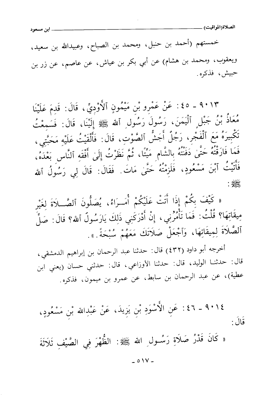 أخرجه أبو داود (٤٣٢) قال حدثنا عبد الرحمن بن إبراهيم، دحيم، الدمشقي، حدَّثنا الوليد بن مسلم، حدَّثنا الأوزاعي، حدثني حسان بن عطية، عن عبد الرحمن بن سابط، عن عمرو بن ميمون الأودي، فذكره.