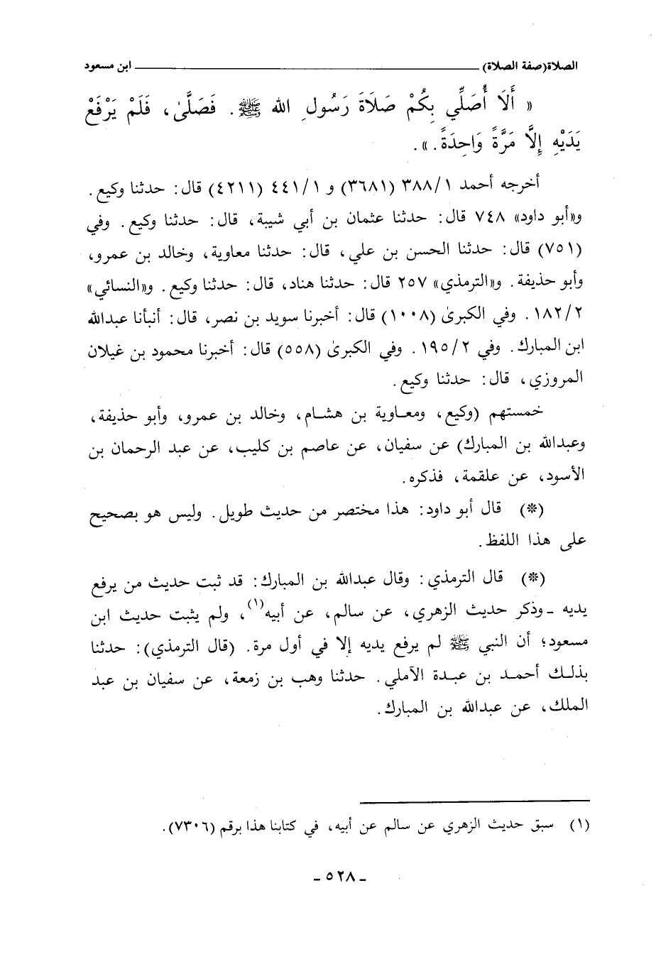 - وقال الترمذي: وقال عبد اللهِ بن المبارك: قد ثبت حديث من يرفع يديه، وذكر حديث الزهري، عن سالم، عن أبيه (٥) , ولم يثبت حديث ابن مسعود؛ أن النبي صلى الله عليه وسلم لم يرفع يديه إلا في أول مرة.