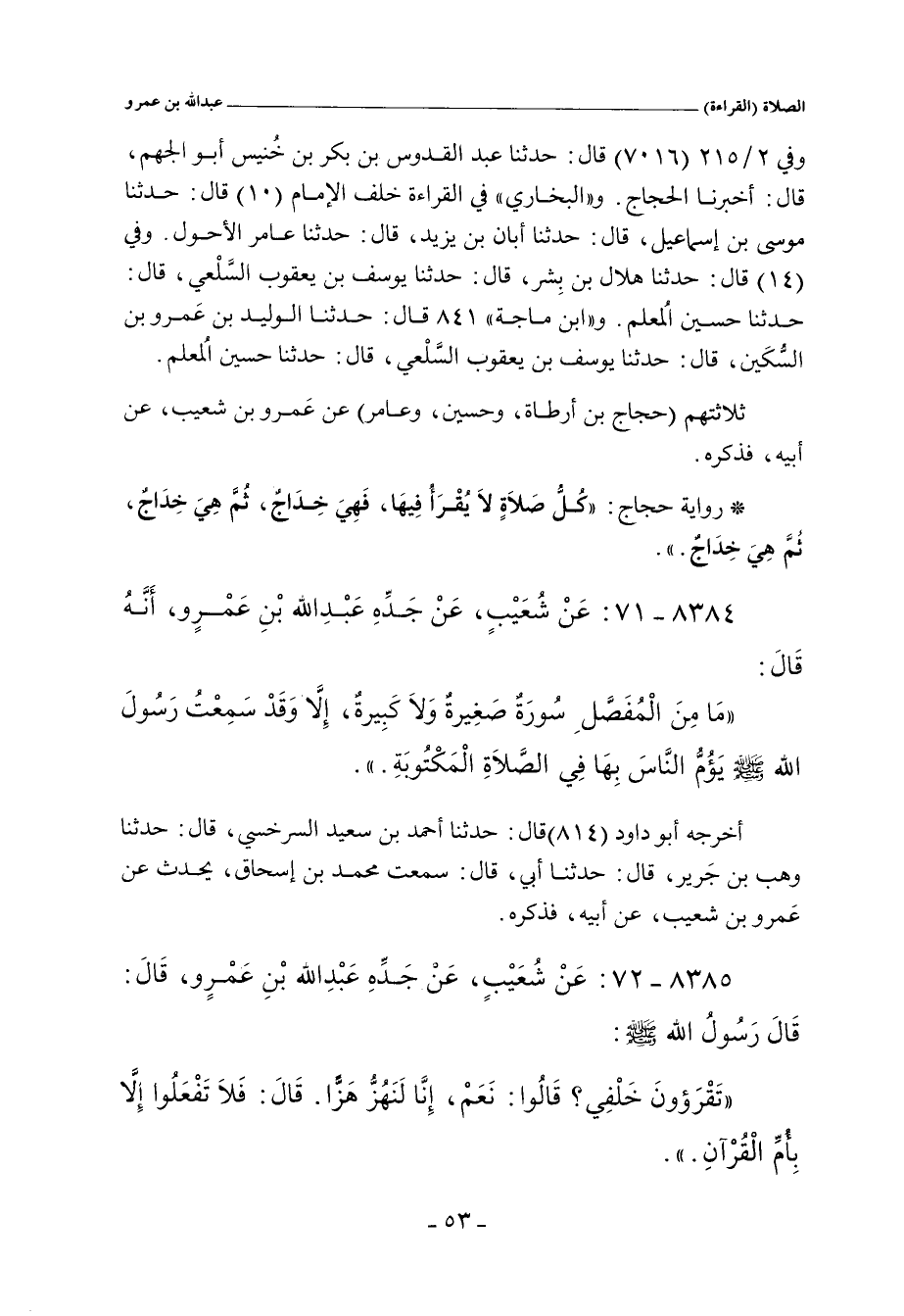وفي ٢/ ٢١٥ (٧٠١٦) قال: حدَّثنا عبد القدوس بن بكر بن خُنيس أبو الجهم، أَخْبَرنا الحجاج. و"البُخَارِي" في "القراءة خلف الإمام" ١٠ قال: حدَّثنا موسى بن إسماعيل، قال: حدَّثنا أبان بن يزيد، قال: حدَّثنا عامر الأحول. وفي (١٤) قال: حدَّثنا هلال بن بِشر، قال: حدَّثنا يوسف بن يعقوب السَّلْعي، قال: حدَّثنا حسين المُعلم. و"ابن ماجة" ٨٤ قال: حدَّثنا الوليد بن عَمرو بن السُّكَين، حدَّثنا يوسف بن يعقوب السَّلْعي، حدَّثنا حسين المُعلم.