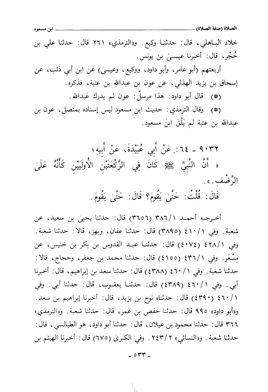 - وقال الترمذيُّ: حديث ابن مسعود ليس إسناده بمتصل، عون بن عبد اللهِ بن عتبة لم يَلْقَ ابنَ مسعود.
