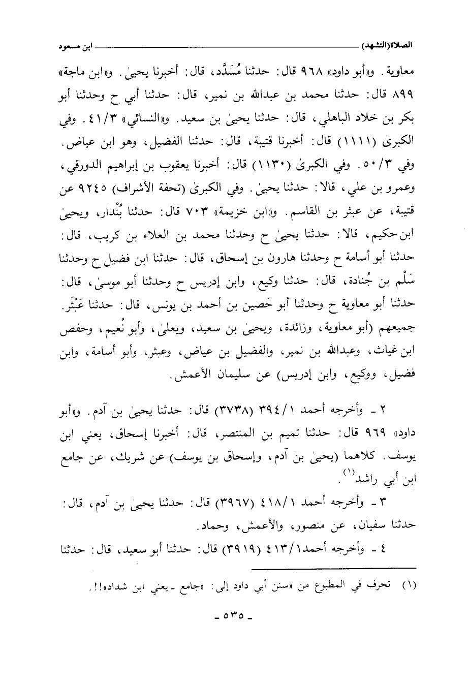 مُسَدَّد، أَخْبَرنا يحيى، عن سليمان الأعمش. و) ابن ماجة) ٨٩٩ قال: حدَّثنا محمد بن عبد اللهِ بن نمير، حدَّثنا أبي، حدَّثنا الأعمش (ح) وحدَّثنا أبو بكر بن خلاد الباهلي، حدَّثنا يحيى بن سعيد، حدَّثنا الأعمش (ح) وحدَّثنا محمد بن مَعْمَر، حدَّثنا قَبيصة، أنبأنا سفيان، عن الأعمش، ومنصور، وحُصين. و) النسائي) ٢/ ٢٤٠، وفي "الكبرى" ٧٥٩ قال: أَخْبَرنا إسماعيل بن مسعود، حدَّثنا خالد، حدَّثنا هشام، هو الدستوائي، عن حماد. وفي ٢/ ٢٤٠، وفي "الكبرى" ٧٦٠ قال: أَخْبَرنا بشر بن خالد العسكري، قال: حدَّثنا غُنْدَر، قال: حدَّثنا شعبة، عن سليمان، ومنصور، وحماد، ومغيرة، وأبي هاشم. وفي ٣/ ٤٠، وفي "الكبرى" ١٢٠ قال: أَخْبَرنا سعيد بن عبد الرحمن، أبو عُبيد اللهِ المخزومي، قال: حدَّثنا سفيان، عن الأعمش، ومنصور. وفي ٣/ ٤، وفي "الكبرى" ١٢٠٣ و ٧٦٥٣ قال: أَخْبَرنا قتيبة، قال: حدَّثنا الفضيل، وهو ابن عياض، عن الأعمش. وفي ٣/ ٥٠، وفي "الكبرى" ١٢٢٢ قال: أَخْبَرنا يعقوب بن إبراهيم الدورقي، وعمرو بن علي، قالا: حدَّثنا يحيى، قال: حدَّثنا سليمان الأعمش. وفي "الكبرى" ١١٥٢٠ قال: أَخْبَرنا قتيبة بن سعيد، قال: حدَّثنا عبثر، عن الأعمش. و) ابن خزيمة (٧٠٣ قال: حدَّثنا بُنْدار، ويحيى بن حكيم، قالا: حدَّثنا يحيى، حدَّثنا الأعمش (ح) وحدَّثنا محمد بن العلاء بن كريب، حدَّثنا أبو أُسامة (ح) وحدَّثنا هارون بن إسحاق، حدَّثنا ابن فضيل (ح) وحدَّثنا سَلْم بن جُنادة، حدَّثنا وكيع، وابن إدريس، كلهم عن الأعمش (ح) وحدتننا أبو موسى، حدَّثنا أبو معاوية (ح) وحدَّثنا أبو حَصين بن أحمد بن يونس، حدَّثنا عَبْثَر، حدَّثنا الأعمش.