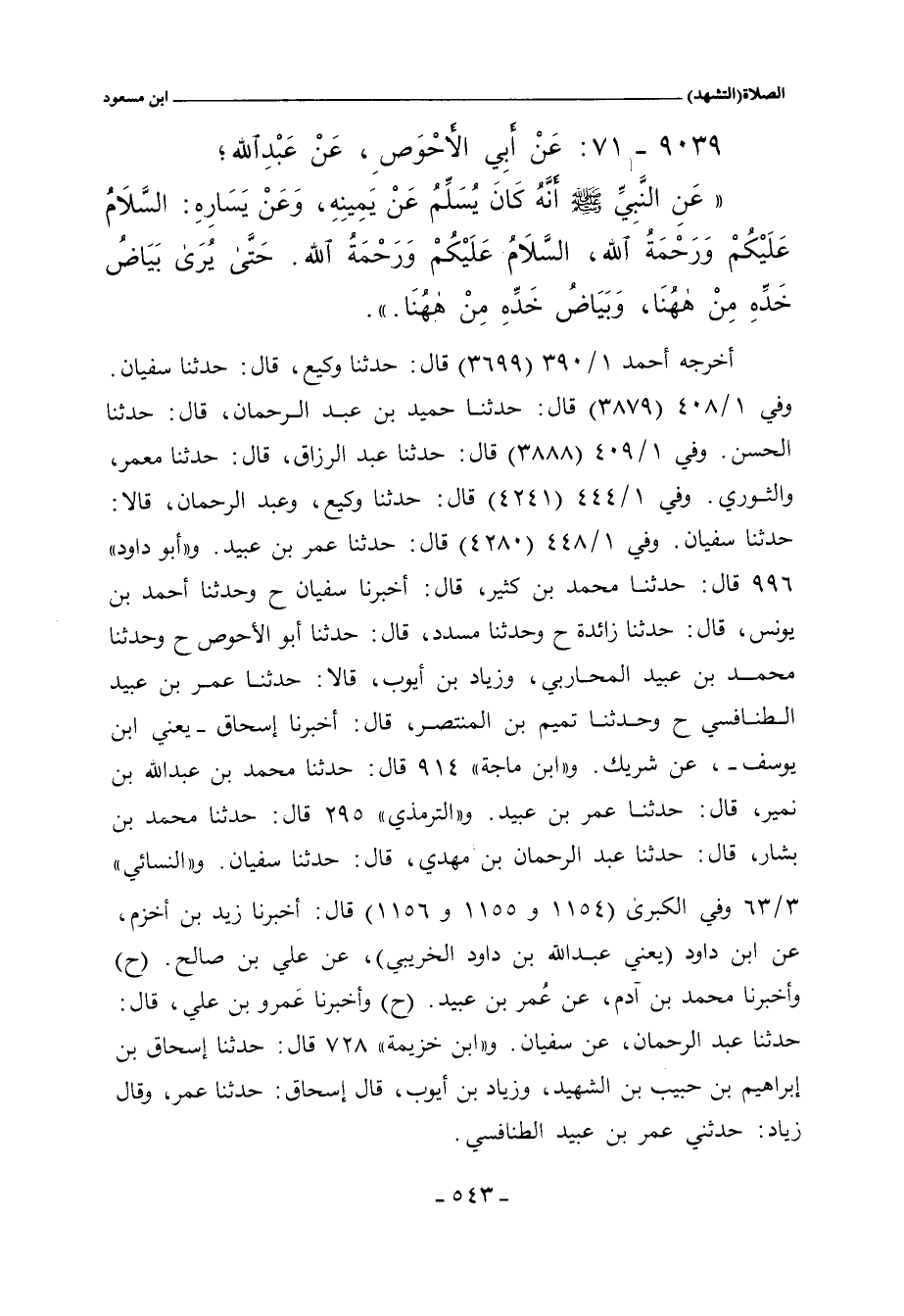 أخرجه أحمد ١/ ٣٩٠ (٣٦٩٩) قال: حدَّثنا وكيع، حدَّثنا سفيان. وفي ١/ ٤٠٨ (٣٨٧٩) قال: حدَّثنا حميد بن عبد الرحمن، حدَّثنا الحسن. وفي ١/ ٤٠٩ (٣٨٨٨) قال: حدَّثنا عبد الرزاق، حدَّثنا مَعْمَر، والثوري. وفي ١/ ٤٤٤ (٤٢٤١) قال: حدَّثنا وكيع، وعبد الرحمن، قالا: حدَّثنا سفيان. وفي ١/ ٤٤٨ (٤٢٨٠) قال: حدَّثنا عمر بن عبيد. و"أبو داود" ٩٩٦ قال: حدَّثنا محمد بن كثير، أَخْبَرنا سفيان (ح) وحدَّثنا أحمد بن يونس، حدَّثنا زائدة (ح) وحدَّثنا مسدد، حدَّثنا أبو الأحوص (ح) وحدَّثنا محمد بن عبيد المحاربي، وزياد بن أيوب، قالا: حدَّثنا عمر بن عبيد الطنافسي (ح) وحدَّثنا تميم بن المنتصر، أَخْبَرنا إسحاق، يعني ابن يوسف، عن شريك. و) ابن ماجة) ٩١٤ قال: حدَّثنا محمد بن عبد اللهِ بن نمير، حدَّثنا عمر بن عبيد. و"التِّرمِذي" ٢٩٥ قال: حدَّثنا محمد بن بشار، حدَّثنا عبد الرحمن بن مهدي، حدَّثنا سفيان. و"النَّسائي" ٣/ ٦٣، وفي "الكبرى" ١٢٤٦ قال: أَخْبَرنا زيد بن أخزم، عن ابن داود، يعني عبد اللهِ بن داود الخريبي، عن علي بن صالح. وفي ٣/ ٦٣، وفي "الكبرى" ١٢٤٧ قال: أَخْبَرنا محمد بن آدم، عن عُمر بن عبيد. وفي ٣/ ٦٣، وفي "الكبرى" ١٢٤٨ قال: أَخْبَرنا عَمرو بن علي، قال: حدَّثنا عبد الرحمن، عن سفيان. و) ابن خزيمة (٧٢٨ قال: حدَّثنا إسحاق بن إبراهيم بن حبيب بن الشهيد، وزياد بن أيوب، قال إسحاق: حدَّثنا عمر، وقال زياد: حدثني عمر بن عبيد الطنافسي