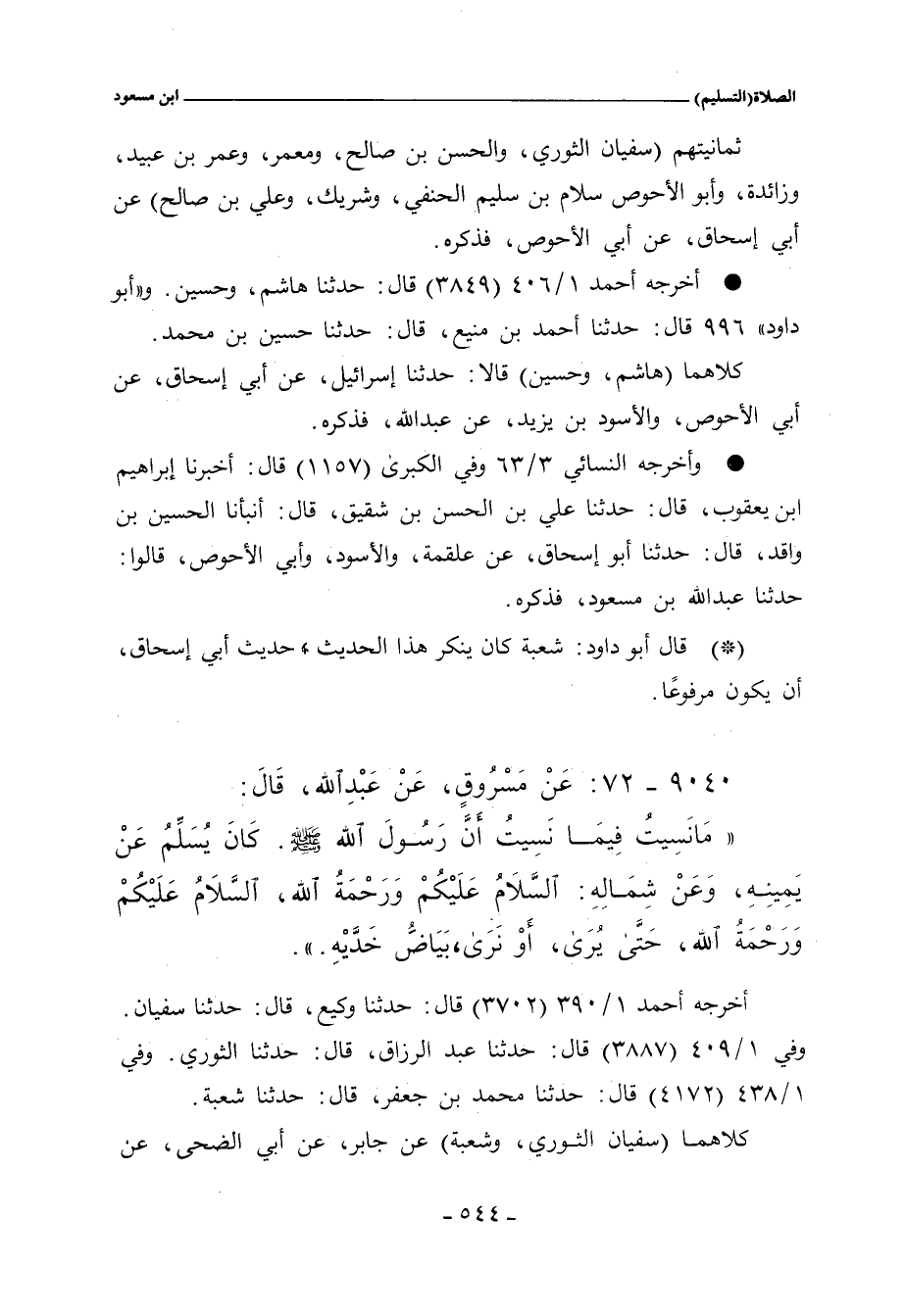 - وفي رواية: مَا نَسِيتُ مِنَ الأَشْيَاءِ، فَإِنَّي لَمْ أَنْسَ تَسْلِيمَ رَسُولِ اللهِ صلى الله عليه وسلم فِي الصَّلَاةِ، عَنْ يَمِينِهِ، وَعَنْ شِمَالِهِ: السَّلَامُ عَلَيْكُمْ وَرَحْمَةُ اللهِ، السَّلَامُ عَلَيْكُمْ وَرَحْمَةُ اْللهِ، ثُمَّ قَالَ: كَأَنَّي أَنْظُرُ إِلَى بَيَاضِ خَدَّيْهِ صلى الله عليه وسلم.