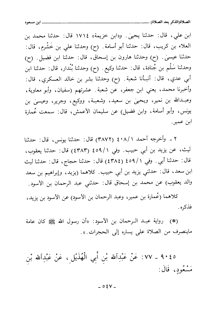جميعهم (سفيان الثوري، وسفيان بن عيينة، وأبو معاوية، وعبد اللهِ بن نمير، ويحيى بن سعيد، وشعبة، وكيع، وجرير، وعيسى بن يونس، وأبو أُسامة، وابن فضيل) عن سليمان الأعمش، قال: سمعت عُمارة بن عمير، عن الأسود بن يزيد، فذكره.