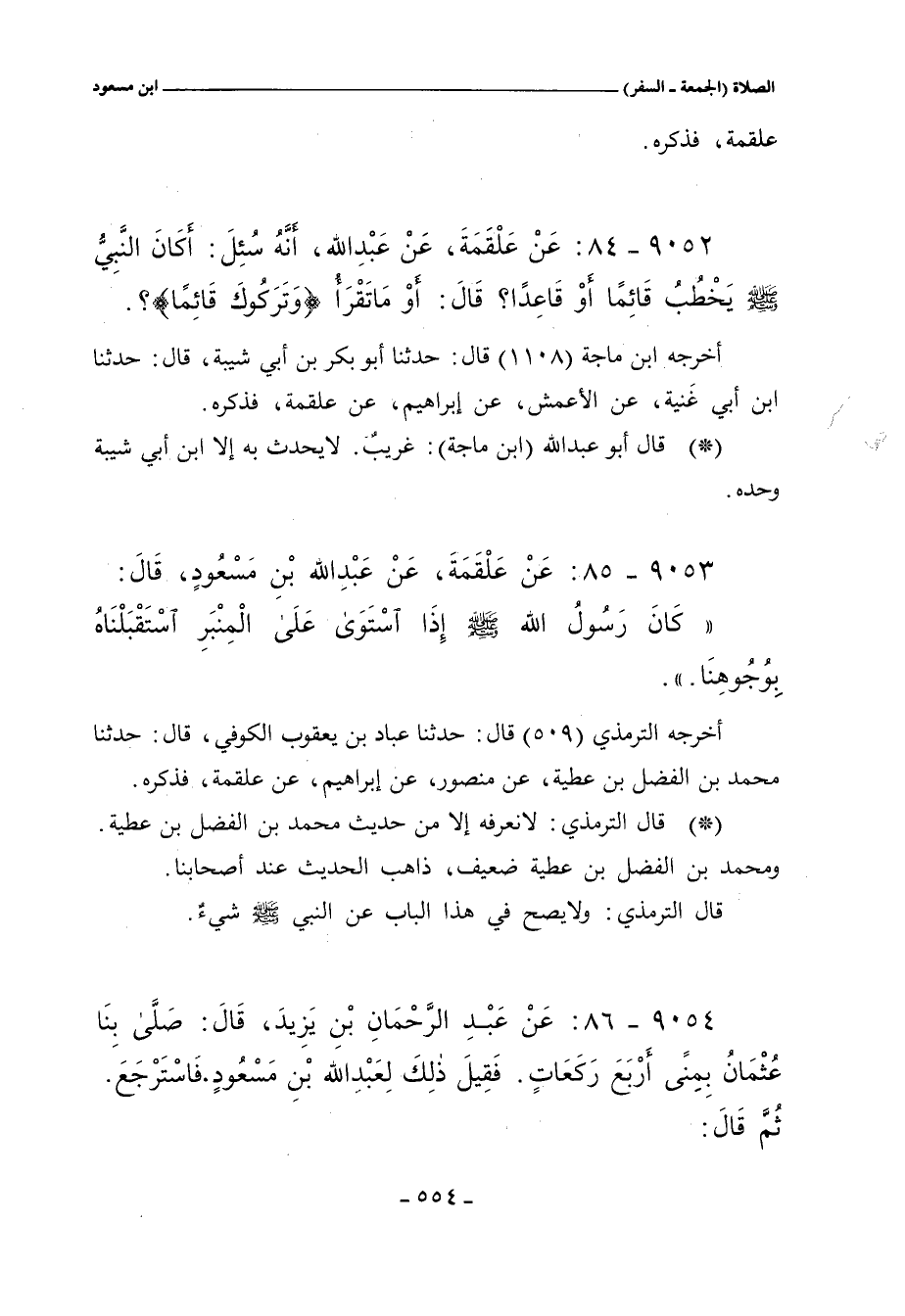 ٩٠٥٢ - عَنْ عَلْقَمَةَ، عَنْ عَبْدِ اللهِ، أَنَّهُ سُئِلَ: أَكَانَ النَّبِيُّ صلى الله عليه وسلم يَخْطُبُ قَائِمًا؟ قَالَ: فَقَالَ: نَعَمْ، ثُمَّ قَرَأَ: (?وَتَرَكُوكَ قَائِمًا".