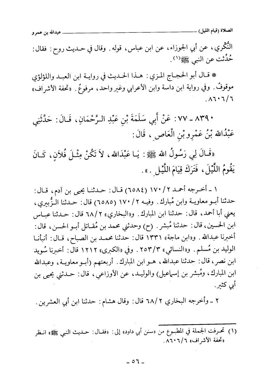 قَالَ لِيَ رَسُولُ اللهِ صلى الله عليه وسلم: يَا عَبْدَ اللهِ، لَا تَكُنْ مِثْلَ فُلَانٍ، كَانَ يَقُومُ اللَّيْلَ، فَتَرَكَ قِيَامَ اللَّيْلِ.
