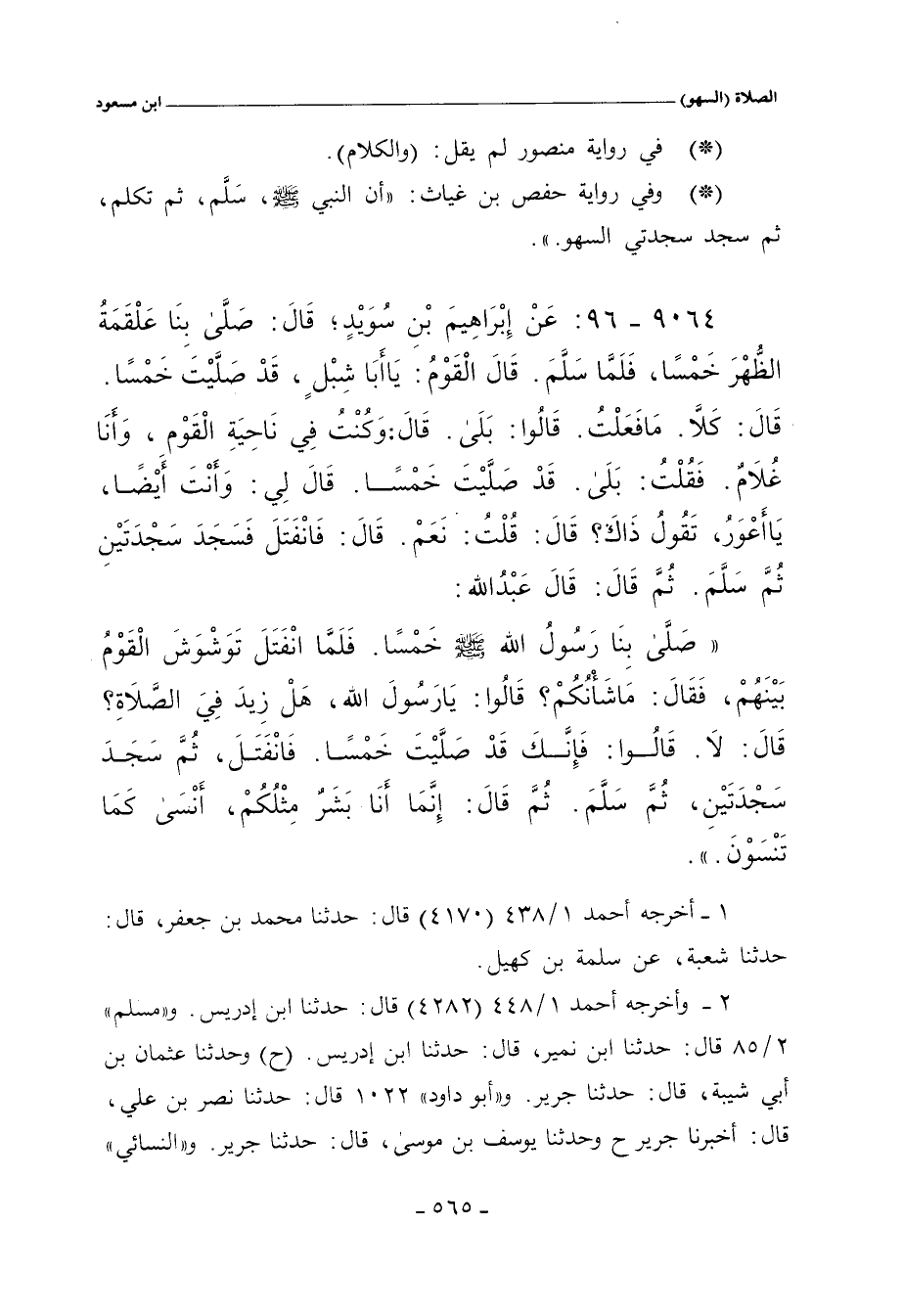 - وفي رواية: عَنْ إِبْرَاهِيمَ بْنِ سُوَيْدٍ، وَكَانَ إِمَامَ مَسْجِدِ عَلْقَمَةَ بَعْدَ عَلْقَمَةَ، قَالَ: صَلَّى بِنَا عَلْقَمَةُ الظُّهْرَ، فَلَا أَدْرِي أَصَلَّى ثَلَاثًا، أَمْ خَمْسًا، فَقِيلَ لَهُ؟ فَقَالَ: وَأَنْتَ يَا أَعْوَرُ؟ فَقُلْتُ: نَعَمْ. قَالَ: فَسَجَدَ سَجْدَتَيْنِ، ثُمَّ حَدَّثَ عَلْقَمَةُ، عَنْ عَبْدِ اللهِ، عَنِ النَّبِيِّ صلى الله عليه وسلم مِثْلَ ذَلِكَ.