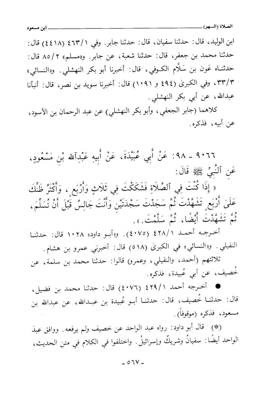 ٩٠٦٦ - عَنْ أَبِي عُبَيدَةَ، عَنْ أَبِيهِ عَبْدِ اللهِ بْن مَسْعودٍ , عَنِ النَّبِيِّ صلى الله عليه وسلم، قَالَ: