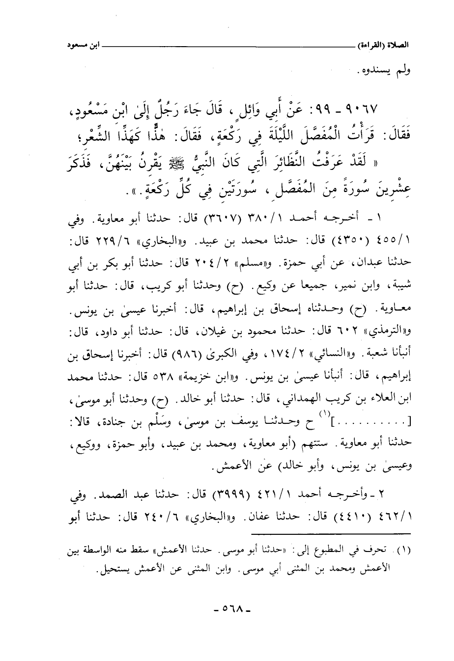 ٩٠٦٧ - عَنْ أَبِي وَائِلٍ، قَالَ: جَاءَ رَجُلٌ إِلَى ابْنِ مَسْعُودٍ، فَقَالَ: قَرَأْتُ الْمُفَصَّلَ اللَّيْلَةَ فِي رَكْعَةٍ، فَقَالَ: هَذًّا كَهَذِّا الشِّعْرِ؛