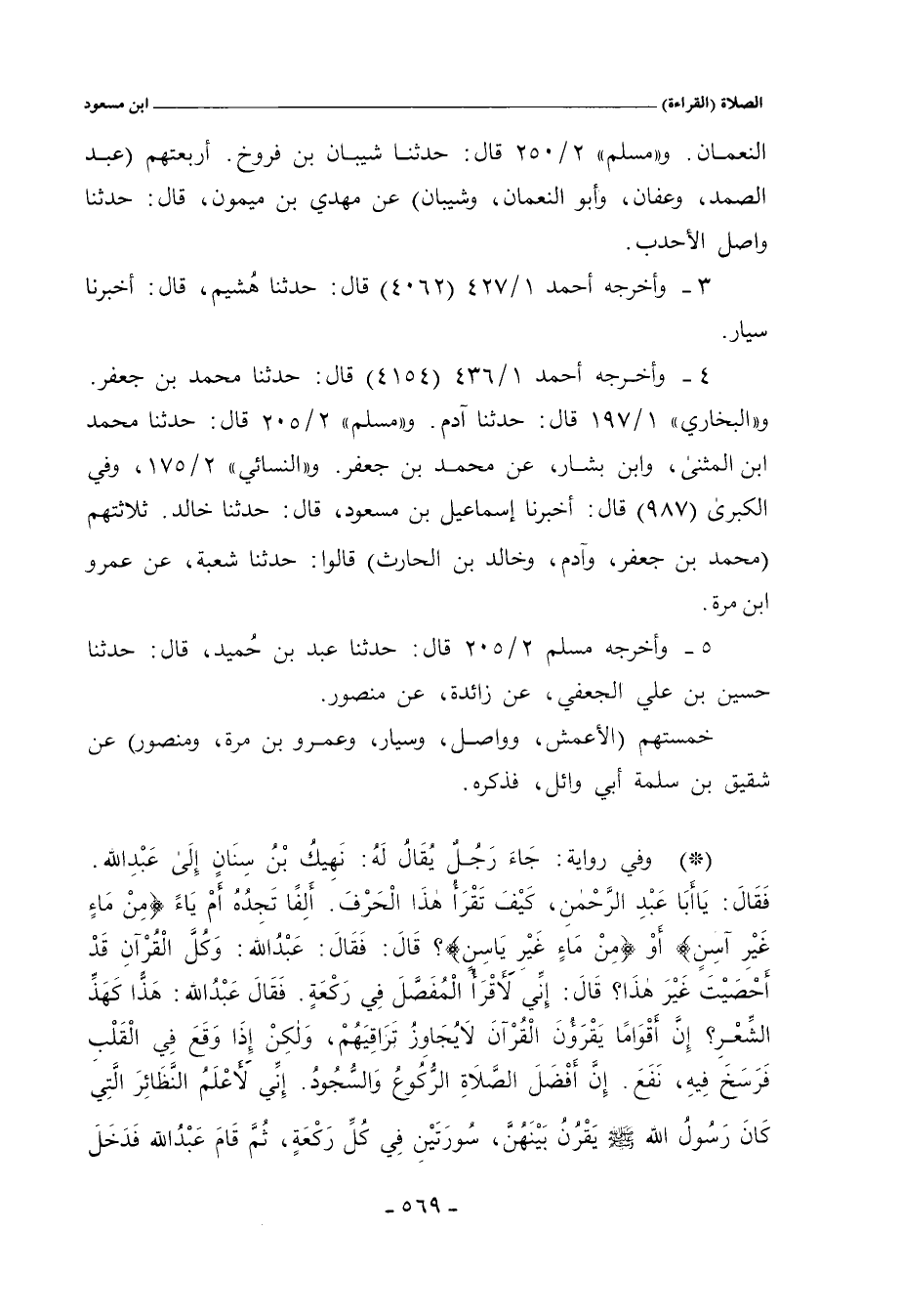 النعمان، حدَّثنا مهدي بن ميمون، حدثنا واصل. و"مسلم" ٢/ ٢٠٤ (١٨٦٠) قال: حدَّثنا أبو بكر بن أبي شيبة، وابن نمير، جميعًا عن وكيع. قال أبو بكر: حدَّثنا وكيع، عن الأعمش. وفي (١٨٦١) قال: وحدَّثنا أبو كريب، حدَّثنا أبو معاوية، عن الأعمش. وفي (١٨٦٢) قال: وحدَّثناه إسحاق بن إبراهيم، أَخْبَرنا عيسى بن يونس، حدَّثنا الأعمش. وفي ٢/ ٢٠٥ (١٨٦٣) قال: حدَّثنا شيبان بن فروخ، حدَّثنا مهدي بن ميمون، حدثنا واصل الأحدب. وفي (١٨٦٤) قال: حدَّثنا عبد بن حُميد، حدثنا حسين بن علي الجعفي، عن زائدة، عن منصور. وفي (١٨٦٥) قال: حدَّثنا محمد بن المثنى، وابن بشار، قال ابن المثنى: حدَّثنا محمد بن جعفر، حدَّثنا شعبة، عن عمرو بن مرة. و"التِّرمِذي" ٦٠٢ قال: حدَّثنا محمود بن