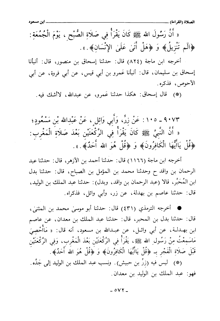- أخرجه الترمذي (٤٣١) قال: حدَّثنا أبو موسى، محمد بن المثنى، حدَّثنا بدل بن المحبر، حدَّثنا عبد الملك بن معدان، عن عاصم بن بهدلة، عن أبي وائل، عن عبد اللهِ بن مسعود، أنه قال: