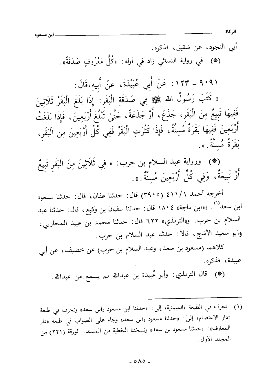 - وفي رواية: فِي ثَلَاثِينَ مِنَ الْبَقَرِ تَبِيعٌ، أَوْ تَبِيعَةٌ، وَفِي كُلِّ أَرْبَعِينَ مُسِنَّةٌ.
