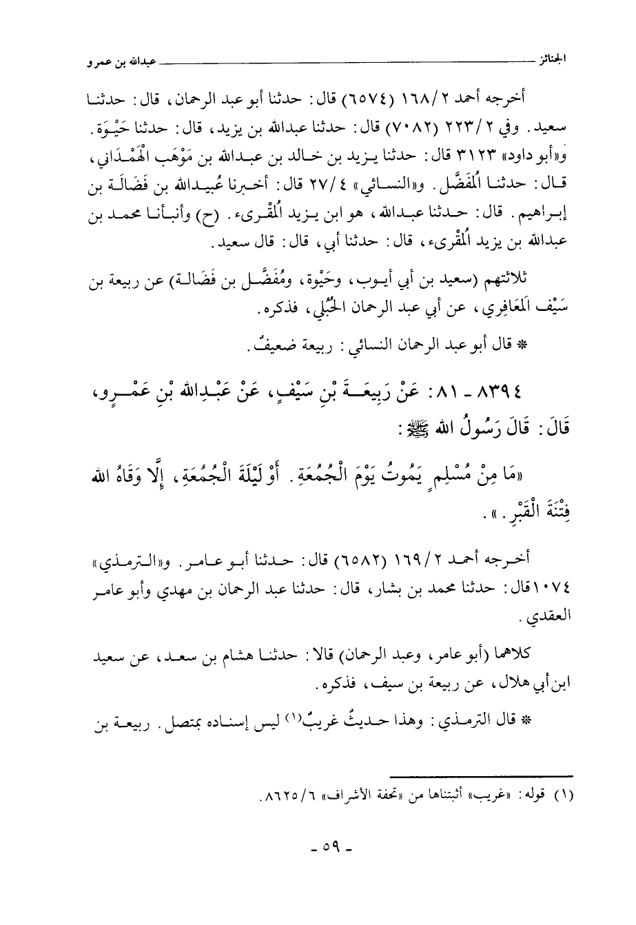 مَا مِنْ مُسْلِمٍ يَمُوتُ يَوْمَ الْجُمُعَةِ، أَوْ لَيْلَةَ الْجُمُعَةِ، إِلَاّ وَقَاهُ الله فِتْنَةَ الْقَبْرِ.
