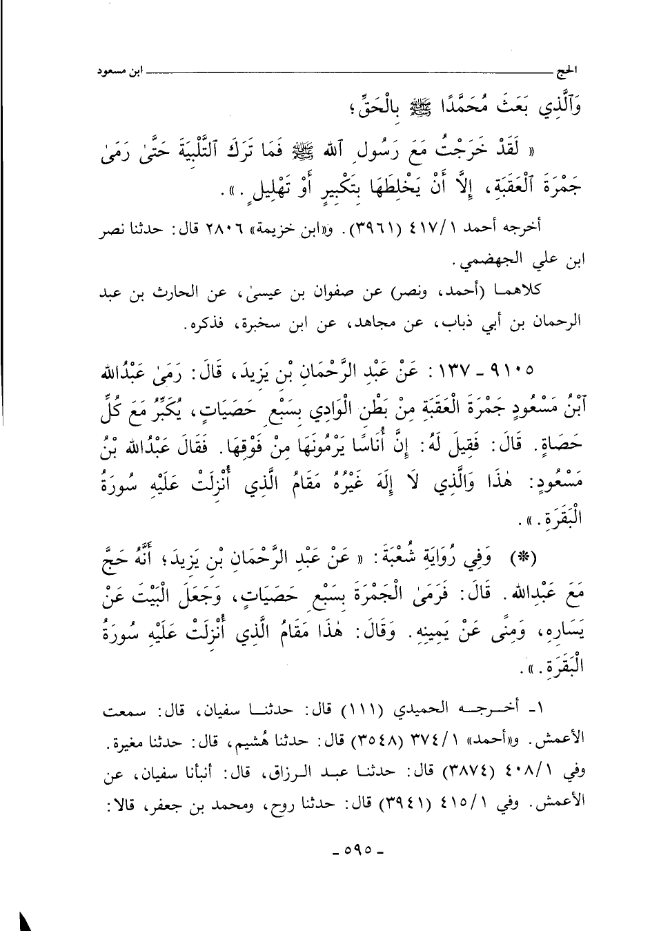٩١٠٥ - عَنْ عَبْدِ الرَّحْمَانِ بْنِ يَزِيدَ، قَالَ: رَمَى عَبْدُ اللهِ بْنُ مَسْعُودٍ جَمْرَةَ الْعَقَبَةِ، مِنْ بَطْنِ الْوَادِي، بِسَبْعِ حَصَيَاتٍ، يُكَبِّرُ مَعَ كُلِّ حَصَاةٍ، قَالَ: فَقِيلَ لَهُ: إِنَّ أُنَاسًا يَرْمُونَهَا مِنْ فَوْقِهَا. فَقَالَ عَبْدُ اللهِ بْنُ مَسْعُودٍ: هَذَا، وَالَّذِي لَا إِلَهَ غَيْرُهُ، مَقَامُ الَّذِي أُنْزِلَتْ عَلَيْهِ سُورَةُ الْبَقَرَةِ