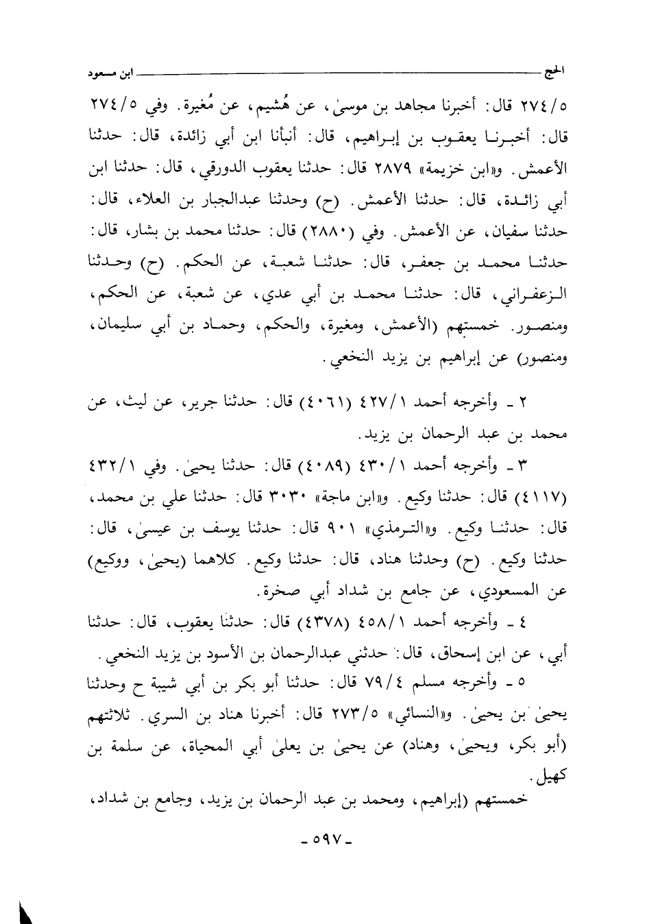 وفي ٥/ ٢٧٤، وفي "الكبرى" ٤٠٦٤ قال: أَخْبَرنا مجاهد بن موسى، عن هُشيم، عن مُغيرة. وفي ٥/ ٢٧٤، وفي "الكبرى" ٤٠٦٥ قال: أَخْبَرنا يعقوب بن إبراهيم، قال: أنبأنا ابن أبي زائدة، قال: حدَّثنا الأعمش. و) ابن خزيمة (٢٨٧٩ قال: حدَّثنا يعقوب الدورقي، حدَّثنا ابن أبي زائدة، حدَّثنا الأعمش (ح) وحدَّثنا عبد الجبار بن العلاء، حدَّثنا سفيان، عن الأعمش. وفي (٢٨٨٠) قال: حدَّثنا محمد بن بشار، حدَّثنا محمد بن جعفر، حدَّثنا شعبة، عن الحكم (ح) وحدَّثنا الزعفراني، حدَّثنا محمد بن أبي عدي، عن شعبة، عن الحكم، ومنصور.