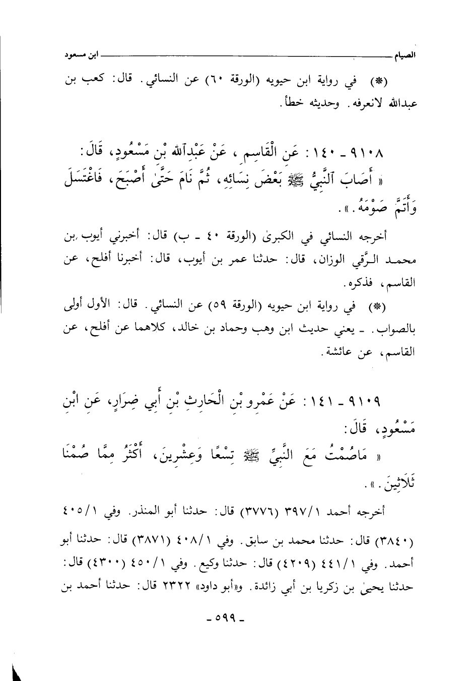 - في رواية ابن حيويه (الورقة - ٥٩) عن النسائي. قال: الأول أولى بالصواب. - يعني حديث ابن وهب، وحماد بن خالد، كلاهما عن أفلح، عن القاسم، عن عائشة -.