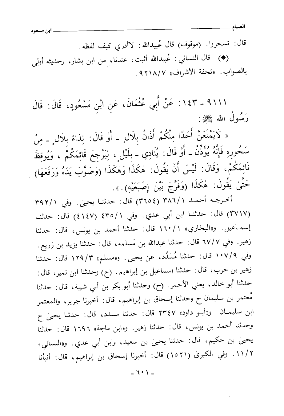 أخرجه أحمد ١/ ٣٨٦ (٣٦٥٤) قال: حدَّثنا يحيى. وفي ١/ ٣٩٢ (٣٧١٧) قال: حدَّثنا ابن أبي عدي. وفي ١/ ٤٣٥ (٤١٤٧) قال: حدَّثنا إسماعيل. و) البخاري) ١/ ١٦٠ (٦٢١) قال: حدَّثنا أحمد بن يونس، قال: حدَّثنا زُهَير. وفى ٧/ ٦٧ (٥٢٩٨) قال: حدَّثنا عبد اللهِ بن مَسلمة، حدَّثنا يزيد بن زريع. وفي ٩/ ١٠٧ (٧٢٤٧) قال: حدَّثنا مُسَدَّد، عن يحيى. و"مسلم" ٣/ ١٢٩ (٢٥٠٨) قال: حدَّثنا زُهَير بن حرب، حدَّثنا إسماعيل بن إبراهيم. وفي (٢٥٠٩) قال: وحدَّثنا ابن نمير، حدَّثنا أبو خالد، يعني الأحمر. وفي (٢٥١٠) قال: حدَّثنا أبو بكر بن أبي شيبة، حدَّثنا مُعتمر بن سليمان (ح) وحدَّثنا إسحاق بن إبراهيم، أَخْبَرنا جرير، والمعتمر بن سليمان. و) أبو داود) ٢٣٤٧ قال: حدَّثنا مسدد، حدَّثنا يحيى (ح) وحدَّثنا أحمد بن يونس، حدَّثنا زُهَير. و) اابن ماجة) ١٦٩٦ قال: حدَّثنا يحيى بن حكيم، حدَّثنا يحيى بن سعيد، وابن أبي عدي. و"النَّسائي" ٢/ ١، وفي "الكبرى" ١٦١٧ قال: أَخْبَرنا إسحاق بن إبراهيم، قال: أنبأنا