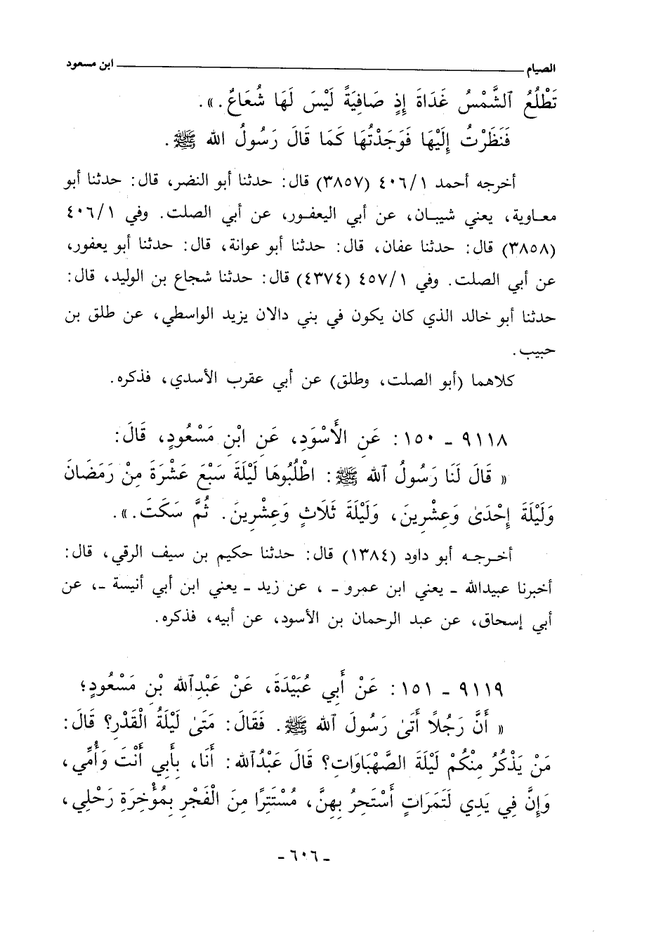 - وفي رواية: أَتَيْنَا ابْنَ مَسْعُودٍ فِي دَارِهِ، فَوَجَدْنَاهُ فَوْقَ الْبَيْتِ، فَسَمِعْنَاهُ يَقُولُ، قَبْلَ أَنْ: يَنْزِلَ صَدَقَ اللَّهُ وَرَسُولُهُ، فَقُلْنَا لَهُ: سَمِعْنَاكَ تَقُولُ، قَبْلَ أَنْ تَنْزِلَ: صَدَقَ اللَّهُ وَرَسُولُهُ؟ فَقَالَ: إِنَّ لَيْلَةَ الْقَدْرِ فِي السَّبْعِ مِنْ النِّصْفِ الآخِرِ، وَذَلِكَ أَنَّ الشَّمْسَ تَطْلُعُ، يَوْمَئِذٍ، بَيْضَاءَ لَا شُعَاعَ لَهَا، فَنَظَرْتُ إِلَى الشَّمْسِ، فَرَأَيْتُهَا كَمَا حَدَّثَ، فَكَبَّرْتُ.