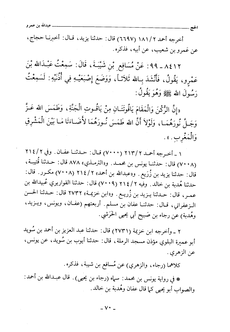 - وفي رواية: عَنْ مُسَافِعِ بْنِ شَيْبَةَ، حَدَّثَنَا عَبْدُ اللهِ بْنُ عَمْرٍو، وَأَدْخَلَ إِصْبَعَهُ فِي أُذُنِهِ: لَسَمِعْتُ رَسُولَ اللهِ صلى الله عليه وسلم يَقُولُ: إِنَّ الْحَجَرَ وَالْمَقَامَ يَاقُوتَتَانِ مِنْ يَاقُوتِ الْجَنَّةِ، طَمَسَ اللهُ نُورَهُمَا، لَوْلَا ذَلِكَ لأَضَاءَتَا مَا بَيْنَ السَّمَاءِ وَالأَرْضِ، أَوْ مَا بَيْنَ الْمَشْرِقِ وَالْمَغْرِبِ.