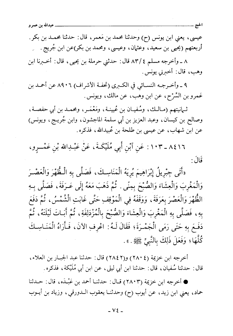- وأخرجه ابن خُزَيمة (٢٨٠٤ و ٢٨٤٢) قال: حدَّثنا عبد الجبار بن العلاء، حدَّثنا سُفيان، حدَّثنا ابن أبي ليلى، عن ابن أبي مُلَيْكة، عَنْ عَبْدِ اللهِ بْنِ عَمْرٍو، قَالَ:
