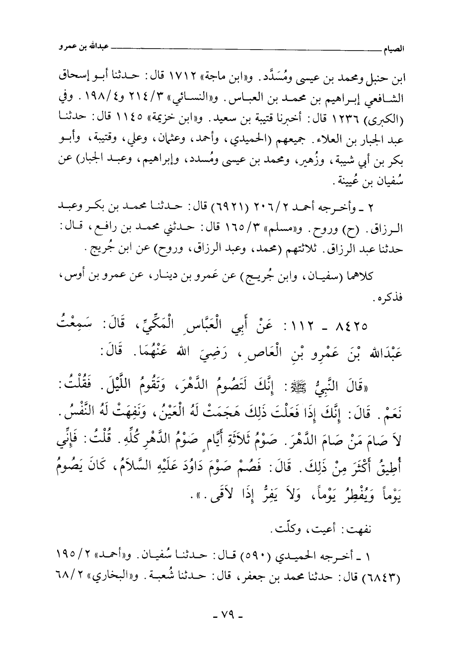 قَالَ النَّبِيُّ صلى الله عليه وسلم: إِنَّكَ لَتَصُومُ الدَّهْرَ، وَتَقُومُ اللَّيْلَ. فَقُلْتُ: نَعَمْ. قَالَ: إِنَّكَ إِذَا فَعَلْتَ ذَلِكَ هَجَمَتْ لَهُ الْعَيْنُ، وَنَفِهَتْ لَهُ النَّفْسُ. لَا صَامَ مَنْ صَامَ الدَّهْرَ. صَوْمُ ثَلَاثَةِ أيَّامٍ صَوْمُ الدَّهْرِ كُلِّهِ. قُلْتُ: فَإِني أُطِيقُ أَكْثَرَ مِنْ ذَلِكَ. قَالَ: فَصُمْ صَوْمَ دَاوُدَ عَلَيْهِ السَّلَامُ، كَانَ يَصُومُ يَوْمًا وَيُفْطِرُ يَوْمًا، وَلَا يَفِرُّ إِذَا لَاقَى.