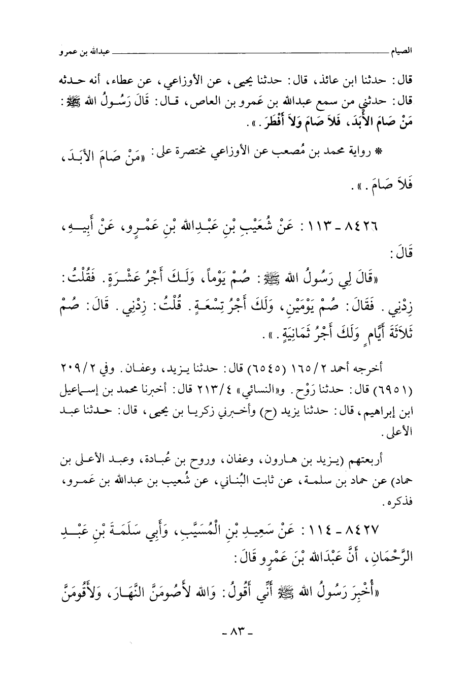 - وفي رواية: عَنْ شُعَيْبِ بْنِ عَبْدِ اللَّهِ بْنِ عَمْرٍو، عَنْ أَبِيهِ عَبْدِ اللَّهِ بْنِ عَمْرٍو، قَالَ قَالَ لِي رَسُولُ اللَّهِ صلى الله عليه وسلم: صُمْ يَوْمًا وَلَكَ عَشْرَةٌ. قُلْتُ: زِدْنِي. قَالَ: صُمْ يَوْمَيْنِ وَلَكَ تِسْعَةٌ. قُلْتُ: زِدْنِي. قَالَ: صُمْ ثَلَاثَةً وَلَكَ ثَمَانِيَةٌ.