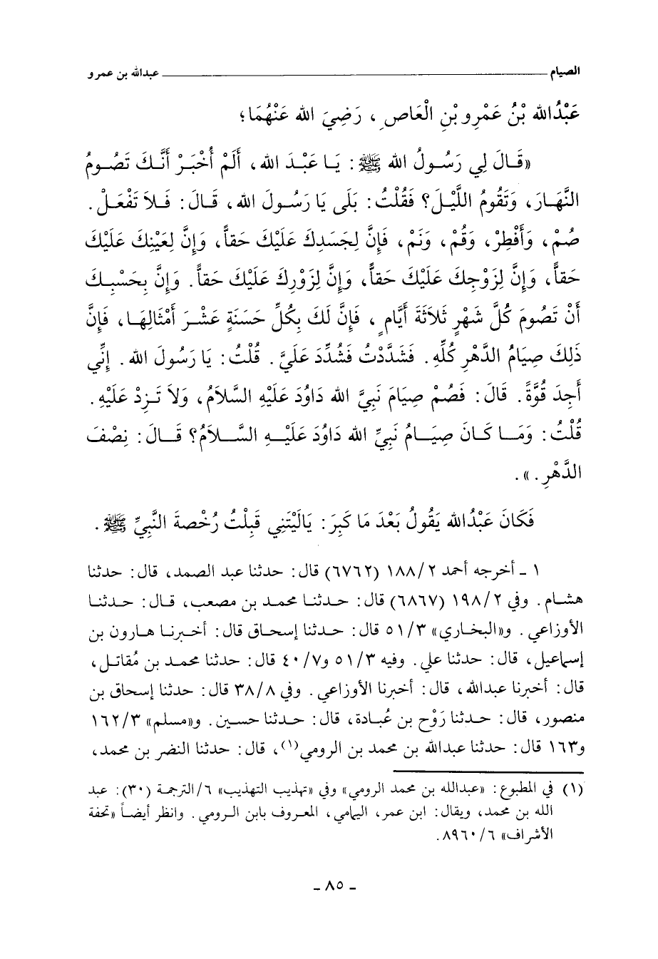 قَالَ لِي رَسُول اللهِ صلى الله عليه وسلم: يَا عَبْدَ اللهِ، أَلَمْ أُخْبَرْ أَنَّكَ تَصُومُ النَّهَارَ، وَتَقُومُ اللَّيْلَ؟ فَقُلْتُ: بَلَى يَا رَسُولَ اللهِ، قَالَ: فَلَا تَفْعَل. صُمْ وَأَفْطِرْ، وَقُمْ وَنَمْ، فَإِنَّ لِجَسَدِكَ عَلَيْكَ حَقًّا، وَإِنَّ لِعَيْنِكَ عَلَيْكَ حَقًّا، وَإِنَّ لِزَوْجِكَ عَلَيْكَ حَقًّا، وَإِنَّ لِزَوْرِكَ عَلَيْكَ حَقًّا، وَإِنَّ بِحَسْبِكَ أَنْ تَصُومَ كُلَّ شَهْرٍ ثَلَاثَةَ أَيَّامٍ، فَإِنَّ لَكَ بِكُلِّ حَسَنَةٍ عَشْرَ أَمْثَالِهَا، فَإِنَّ ذَلِكَ صِيَامُ الدَّهْرِ كُلِّهِ. فَشَدَّدْتُ فَشُدِّدَ عَلَيَّ. قُلْتُ: يَا رَسُولَ اللهِ، إِنِّي أَجِدُ قُوَّةً. قَالَ: فَصُمْ صِيَامَ نَبِيَّ اللهِ دَاوُدَ، عَلَيْهِ السَّلَامُ، وَلَا تَزِدْ عَلَيْهِ. قُلْتُ: وَمَا كَانَ صِيَامُ نَبِيِّ اللهِ دَاوُدَ، عَلَيْهِ السَّلَامُ؟ قَالَ: نِصْفَ الدَّهْرِ.