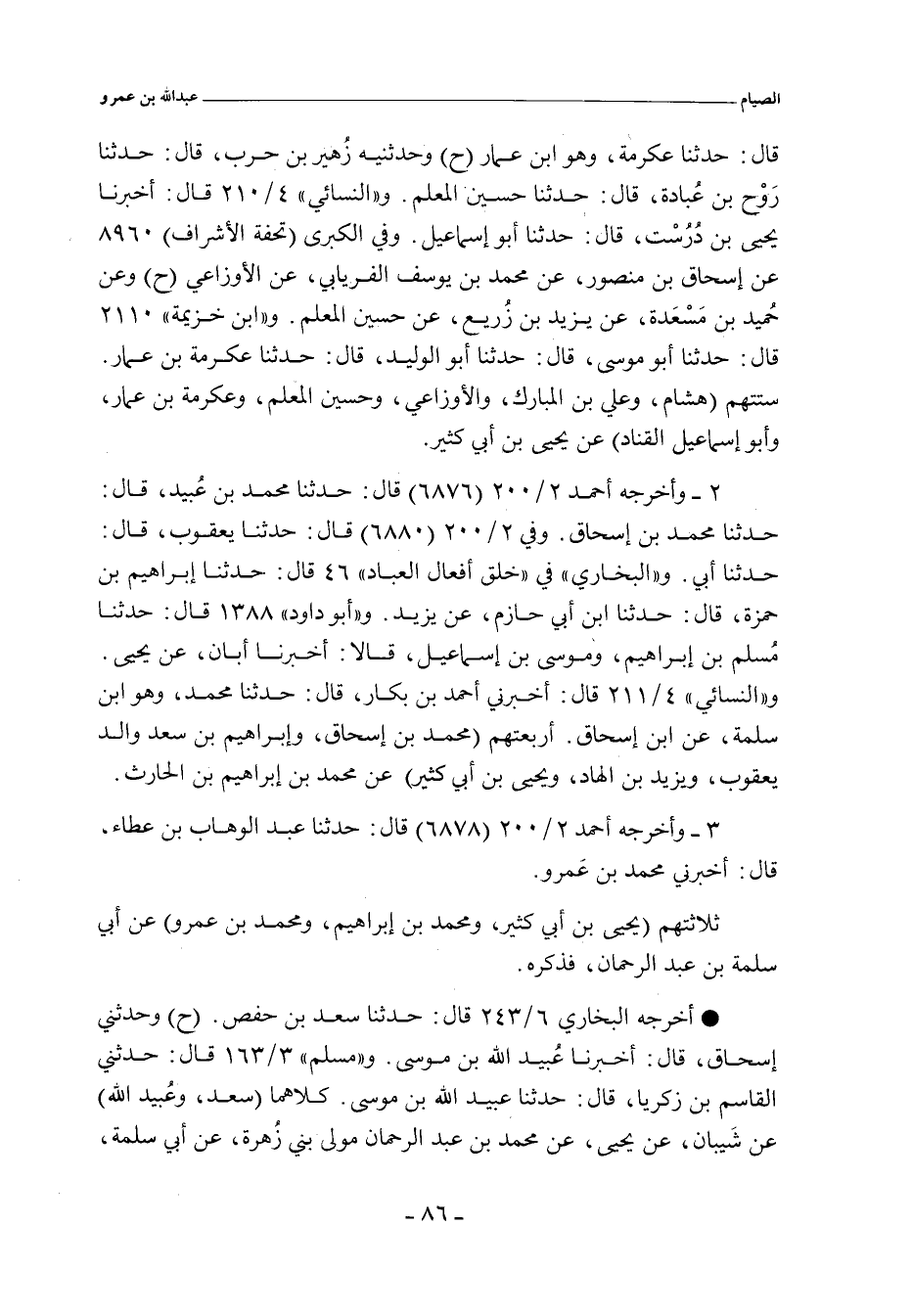 حَدَّثَنا عكرمة، وهو ابن عمار، حدَّثنا يحيى. وفي ٣/ ١٦٣ (٢٧٠١) قال: وحدَّثني زُهير بن حرب، حدَّثنا رَوْح بن عُبادة، حدَّثنا حسين المعلم، عن يَحيى بن أبي كثير. و"النَّسائي" ٤/ ٢١٠، وفي "الكبرى" ٢٧١٢ قال: أَخْبَرنا يَحيى بن دُرسْت، قال: حدَّثنا أبو إسماعيل. قال: حدَّثنا يَحيى بن أبي كثير. وفي ٤/ ٢١، وفي "الكبرى" ٢٧١٤ قال: أخبرني أحمد بن بكار. قال: حدَّثنا محمد، وهو ابن سلمة، عن ابن إسحاق، عن محمد بن إبراهيم. وفي "الكبرى" ٢٩٣٤ قال: أَخْبَرنا إسحاق بن منصور. قال: أَخْبَرنا محمد بن يوسف. قال: حدثنا الأوزاعي، عن يَحيى بن أبي كثير. وفي (٢٩٣٥) قال: أَخْبَرنا حُميد بن مَسْعَدة البصري، عن يزيد، وهو ابن زُريع. قال: حدثني حسين المعلم.