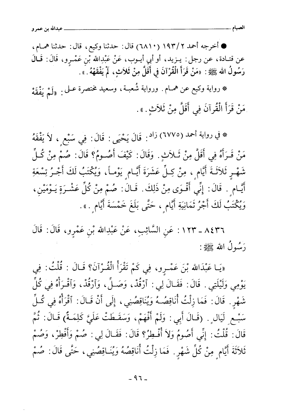 يَا عَبْدَ اللهِ بْنَ عَمْرٍو، فِي كَمْ تَقْرَأُ الْقُرْآنَ؟ قَالَ: قُلْتُ: فِي يَوْمِي وَلَيْلَتِي. قَالَ: فَقَالَ لِي: ارْقُدْ، وَصَلِّ، وَارْقُدْ، وَاقْرَأْهُ فِي كُلِّ شَهْرٍ. قَالَ: فَمَا زِلْتُ أُنَاقِصُهُ وَيُنَاقِصُنِي، إِلَى أَنْ قَالَ: اقْرَأْهُ فِي كُلِّ سَبْعِ لَيَالٍ (قَالَ أَبِي: وَلَمْ أَفْهَمْ، وَسَقَطَتْ عَلَيَّ كَلِمَةٌ) قَالَ: ثُمَّ قَالَ: قُلْتُ: إِنِّي أَصُومُ وَلَا أُفْطِرُ؟ قَالَ: فَقَالَ لِي: صُمْ وَأَفْطِرْ، وَصُمْ ثَلَاثَةَ أَيَّامٍ مِنْ كُلِّ شَهْرٍ. فَمَا زِلْتُ أُنَاقِصُهُ وَيُنَاقِصُنِي، حَتَّى قَالَ: صُمْ