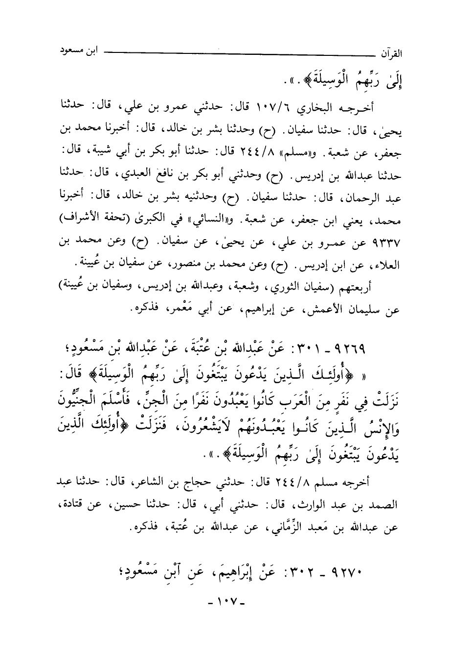 - وفي رواية: عَنْ عَبْداللهِ؛ (إِلَى رَبِّهِمِ الْوَسِيلَةَ) قَالَ: كَانَ نَاسٌ مِنَ الإِنْسِ يَعْبُدُونَ نَاسًا مِنَ الْجِنِّ، فَأَسْلَمَ الْجِنُّ، وَتَمَسَّكَ هَؤُلَاءِ بِدِينِهِمْ. (