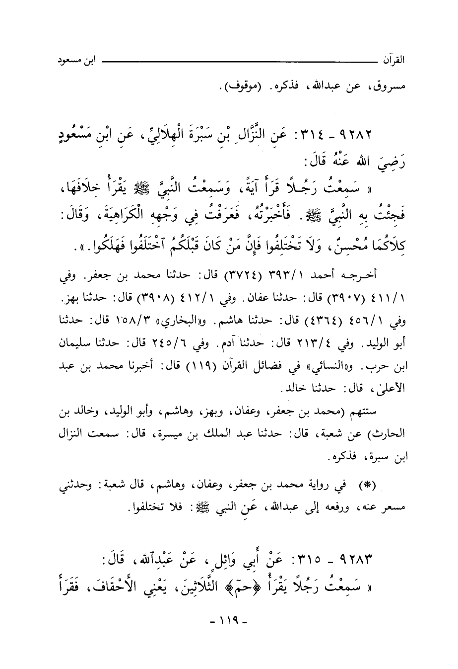 سَمِعْتُ رَجُلاً قَرَأَ آيَةً، وَسَمِعْتُ النَّبِيَّ صلى الله عليه وسلم يَقْرَأُ خِلَافَهَا، فَجِئْتُ بِهِ النَّبِيَّ صلى الله عليه وسلم، فَأَخْبَرْتُهُ، فَعَرَفْتُ فِي وَجْهِهِ الْكَرَاهِيَةَ، وَقَالَ: كِلَاكُمَا مُحْسِنٌ، وَلَا تَخْتَلِفُوا، فَإِنَّ مَنْ كَانَ قَبْلَكُمُ اخْتَلَفُوا فَهَلَكُوا. ١.