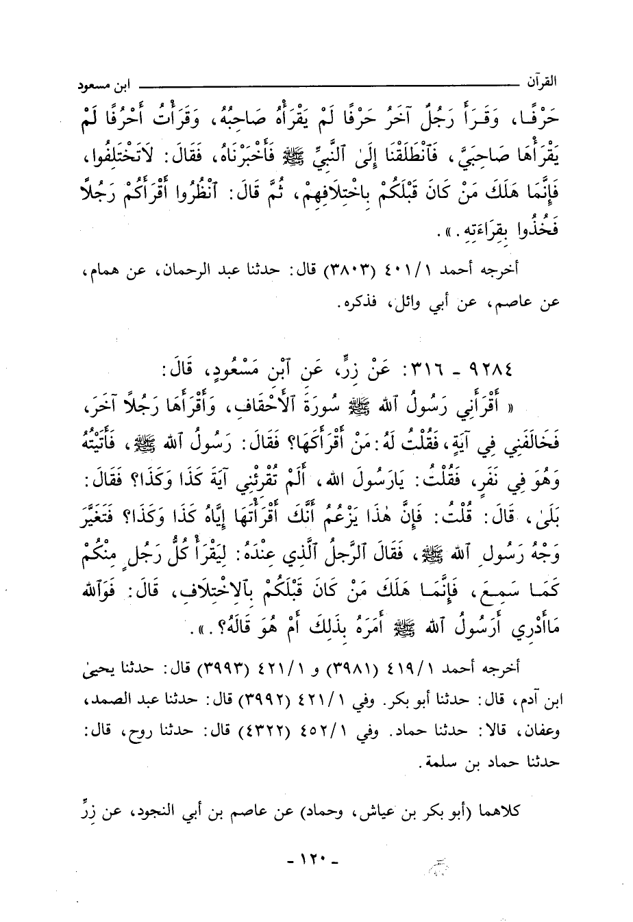 حَرْفًا، وَقَرأَ رَجُلٌ آخَرُ حَرْفًا لَمْ يَقْرَأْهُ صَاحِبُهُ، وَقَرَأْتُ أَحْرُفًا فَلَمْ يَقْرَأْهَا صَاحِبَيَّ، فَانْطَلَقْنَا إِلَى النَّبِيِّ صلى الله عليه وسلم فَأَخْبَرْنَاهُ، فَقَالَ: لَاتَخْتَلِفُوا، فَإِنَّمَا هَلَكَ مَنْ كَانَ قَبْلَكُمْ بِاخْتِلَافِهِمْ، ثُمَّ قَالَ: انْظُرُوا أَقْرَأَكُمْ رَجُلاً فَخُذُوا بِقِرَاءَتِهِ.