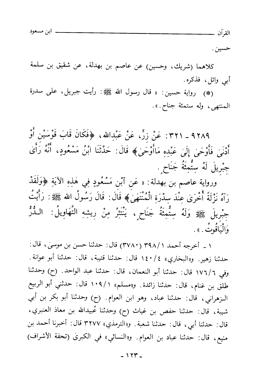 ٩٢٨٩ - عَنْ زِرَّ، عَنِ عَبْداللهِ، قَالَ: " فَكَانَ قَابَ قَوْسَيْنِ أَوْ أَدْنَى فَأَوْحَى إِلَى عَبْدِهِ مَا أَوْحَى) قَالَ: حدَّثنا ابْنُ مَسْعُودٍ، أَنَّهُ رَأَى جِبْرِيلَ، وَلَهُ سِتُّمِئَةِ جَنَاحٍ. (