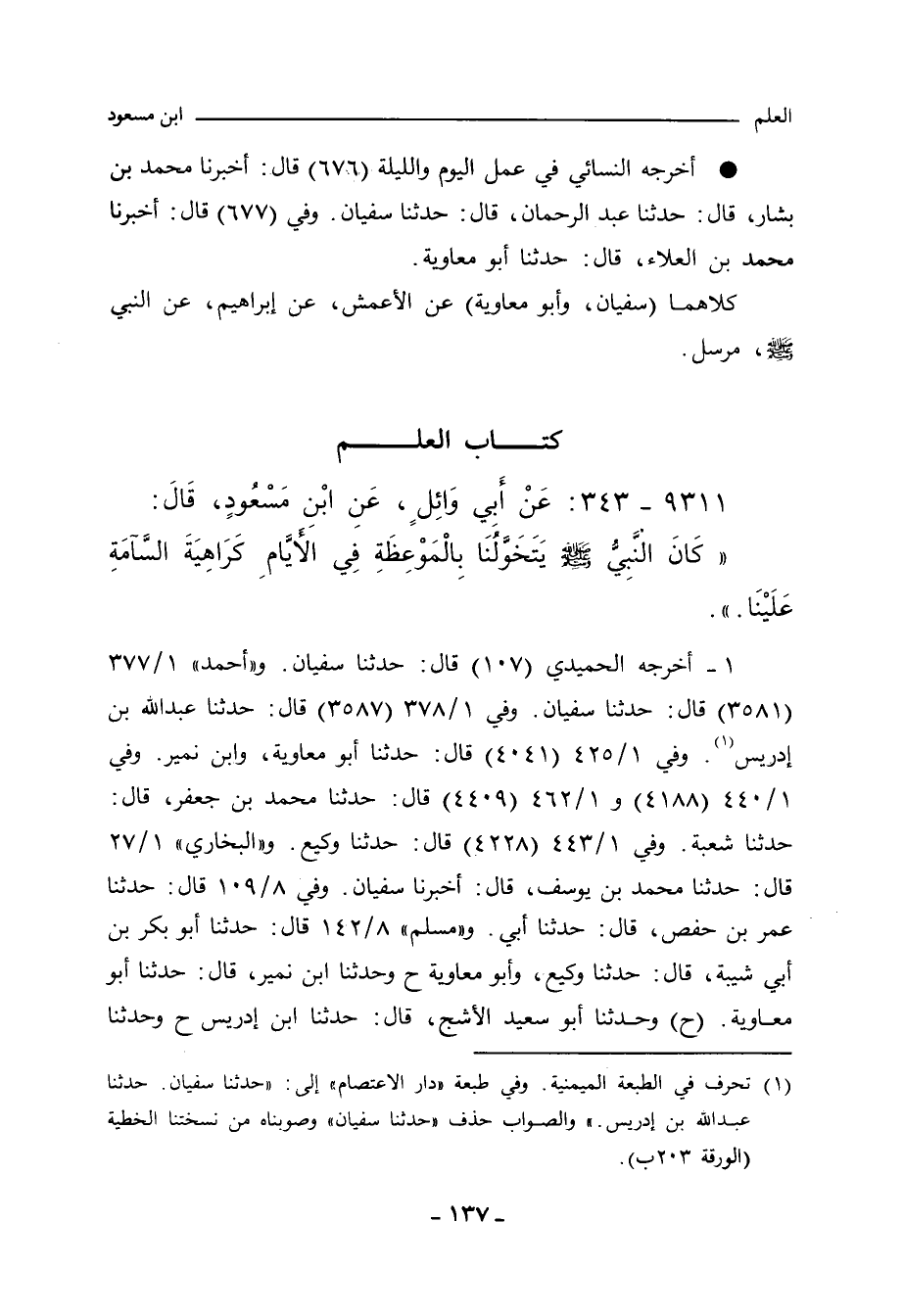 ا - أخرجه الحميدي (١٠٧) قال: حدَّثنا سفيان. و) أحمد (١/ ٣٧٧ (٣٥٨١) قال: حدَّثنا سفيان. وفي ١/ ٣٧٨ (٣٥٨٧) قال: حدَّثنا عَبد اللهِ بن إدريس. وفي ١/ ٤٢٥ (٤٠٤١) قال: حدَّثنا أبو معاوية، وابن نمير. وفي ١/ ٤٤٠ (٤١٨٨) و ١/ ٤٦٢ (٤٤٠٩) قال: حدَّثنا محمد بن جعفر، حدَّثنا شُعبة. وفي ١/ ٤٤٣ (٤٢٢٧) قال: حدَّثنا وكيع. و) البُخاري (١/ ٢٧ (٦٨) قال: حدَّثنا محمد بن يوسف، قال: أَخْبَرنا سفيان. وفي ٨/ ١٠٩ (٦٤١١) قال: حدَّثنا عمر بن حفص، حدَّثنا أبي. و"مسلم" ٨/ ١٤٢ (٧٢٢٩) قال: حدَّثنا أبو بكر بن أبىِ شيبة، حدَّثنا وكيع، وأبو معاوية (ح) وحدَّثنا ابن نمير، حدَّثنا أبو معاوية. وفي (٧٢٣٠) قال: حدَّثنا أبو سعيد الأشج، حدَّثنا ابن إدريس (ح) وحدَّثنا