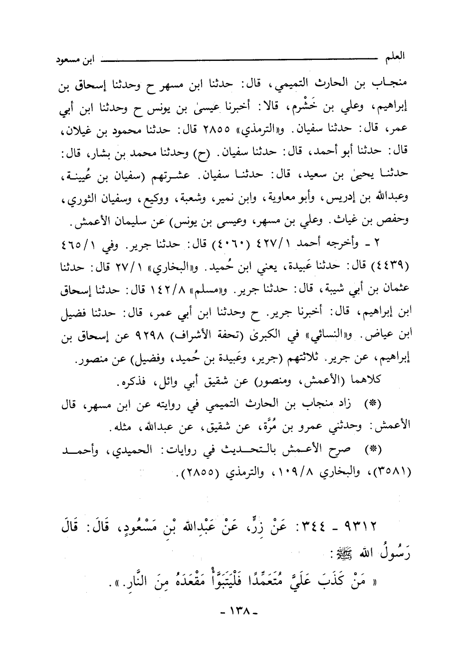 ٢ - وأخرجه أحمد ١/ ٤٢٧ (٤٠٦٠) قال: حدَّثنا جرير. وفي ١/ ٤٦٥ (٤٤٣٩) قال: حدَّثنا عَبيدة، يعني ابن حُميد. و) البُخاري (١/ ٢٧ (٧٠) قال: حدَّثنا عثمان بن أبي شيبة، قال: حدَّثنا جرير. و"مسلم" ٨/ ١٤٢ (٧٢٣١) قال: حدَّثنا إسحاق بن إبراهيم، أَخْبَرنا جرير (ح) وحدَّثنا ابن أبي عمر، حدَّثنا فضيل بن عياض. و"النَّسائي" في "الكبرى"٥٨٥٩ قال: أَخْبَرنا إسحاق بن إبراهيم، قال: أنبأنا جري.