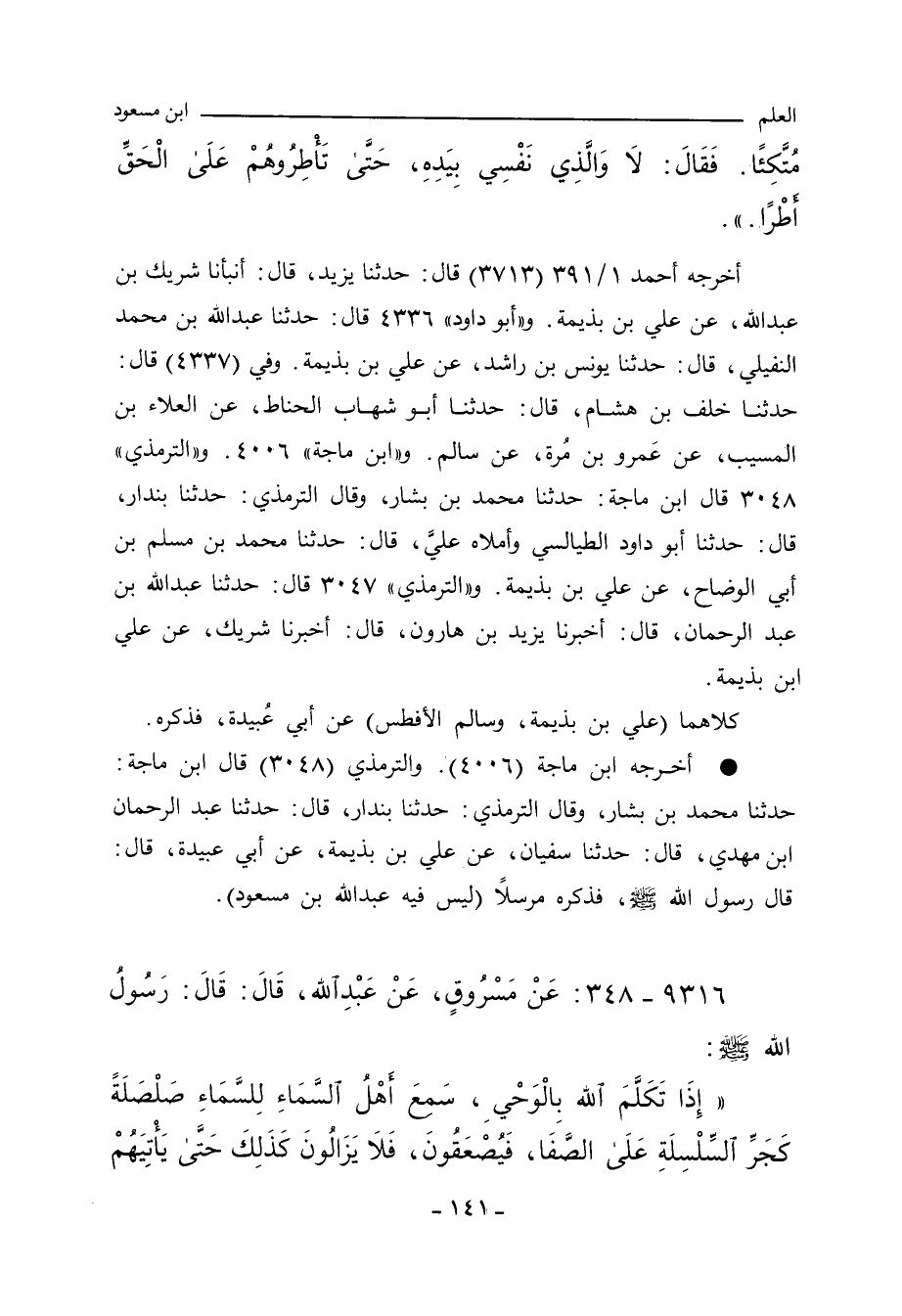 أخرجه أحمد ١/ ٣٩١ (٣٧١٣) قال: حدَّثنا يزيد، أنبأنا شريك بن عَبد اللهِ، عن علي بن بذيمة. و"أبو داود" ٤٣٣٦ قال: حدَّثنا عَبد اللهِ بن محمد النفيلي، حدَّثنا يونس بن راشد، عن علي بن بذيمة. وفي (٤٣٣٧) قال: حدَّثنا خلف بن هشام، حدَّثنا أبو شهاب الحناط، عن العلاء بن المسيب، عن عَمرو بن مُرة، عن سالم. و) اابن ماجة (٤٠٠٦ قال: حدَّثنا محمد بن بشار، حدَّثنا أبو داود، أملاه عليَّ، حدَّثنا محمد بن أبي الوضاح، عن علي بن بذيمة. و"التِّرمِذي" ٣٠٤٧ قال: حدَّثنا عَبد اللهِ بن عبد الرحمن، أَخْبَرنا يزيد بن هارون، أَخْبَرنا شريك، عن علي بن بذيمة. وفي (٣٠٤٨) قال: حدَّثنا بندار، حدَّثنا أبو داود الطيالسي، وأملاه عليَّ، حدَّثنا محمد بن مسلم بن أبي الوضاح، عن علي بن بذيمة.
