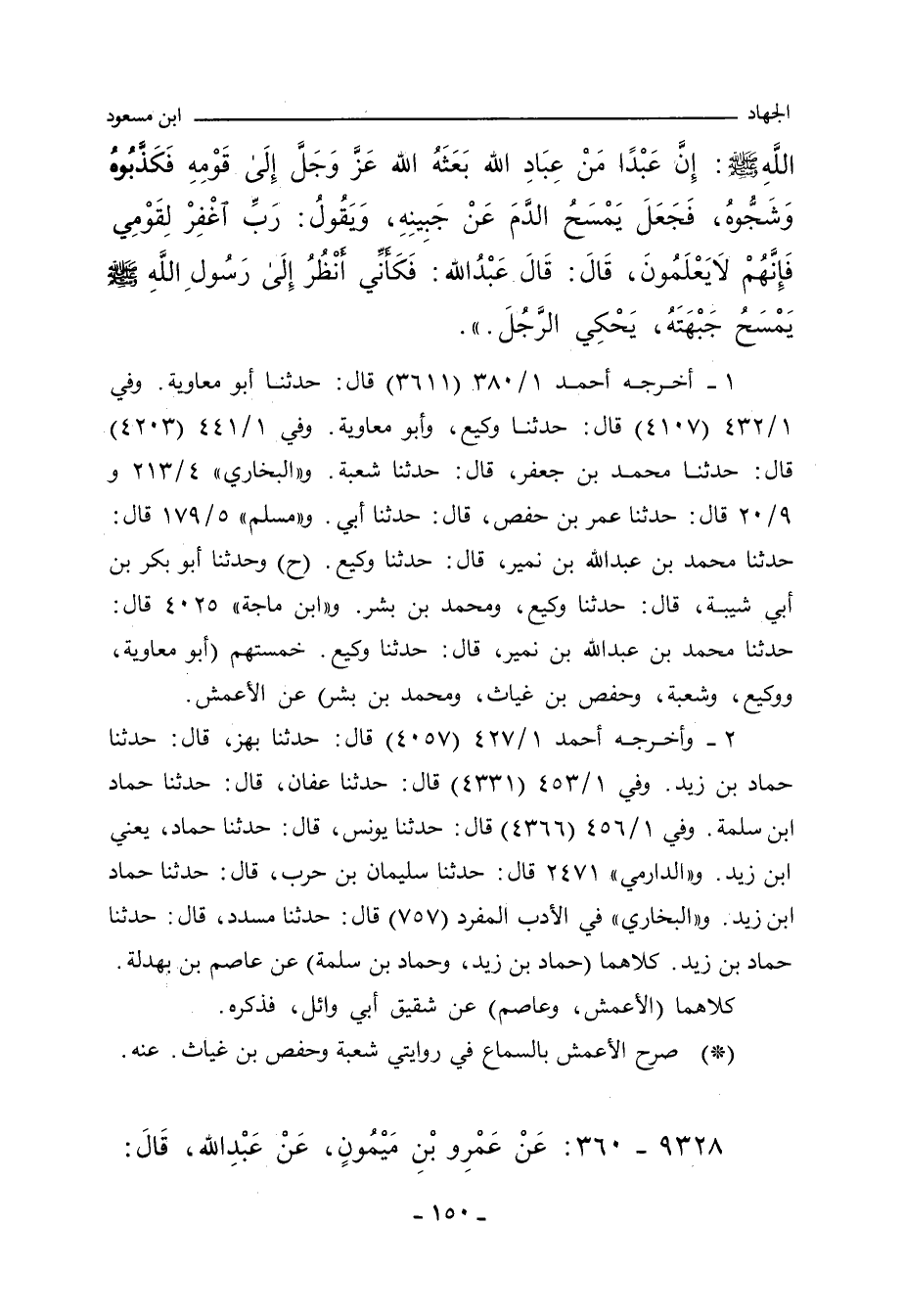 اللهِ صلى الله عليه وسلم: إِنَّ عَبْدًا مَنْ عِبَادِ اللهِ بَعَثَهُ اللَّهُ، عَزَّ وَجَلَّ، إِلَى قَوْمِهِ، فَكَذَّبُوُ وَشَجُّوهُ، فَجَعَلَ يَمْسَحُ الدَّمَ عَنْ جَبِينِهِ، وَيَقُولُ: رَبِّ اغْفِرْ لِقَوْمِي فَإِنَّهُمْ لايَعْلَمُونَ، قَالَ: قَالَ عَبْدُ اللهِ: فَكَأَنِّي أَنْظُرُ إِلَى رَسُولِ اللهِ صلى الله عليه وسلم يَمْسَحُ جَبْهَتَهُ، يَحْكِي الرَّجُلَ. ١.