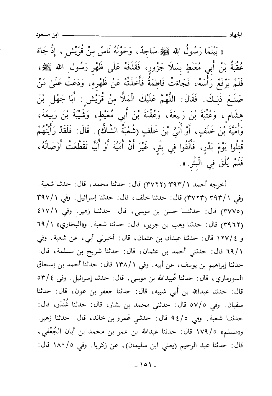 بَيْنَمَا رَسُولُ اللهِ صلى الله عليه وسلم سَاجِدٌ، وَحَوْلَهُ نَاسٌ مِنْ قُرَيْشٍ، إِذْ جَاءَ عُقْبَةُ بْنُ أَبِي مُعَيْطٍ بِسَلَى جَزُورٍ، فَقَذَفَهُ عَلَى ظَهْرِ رَسُولِ اللهِ صلى الله عليه وسلم، فَلَمْ يَرْفعْ رَأْسَهُ، فَجَاءَتْ فَاطِمَةُ فَأَخَذَتْهُ مِنْ ظَهْرِهِ، وَدَعَتْ عَلَى مَن صَنَعَ ذَلِكَ، قَالَ: فَقَالَ: اللَّهُمَّ عَلَيْكَ الْمَلأَ مِنْ قُرَيْشٍ: أَبَا جَهْلِ بْنَ هِشَامٍ، وَعُتْبَةَ بْنَ رَبِيعَةَ، وَشَيْبَةَ بْنَ رَبِيعَةَ، وَعُقْبَةَ بْنَ أَبِي مُعَيْطٍ، وَأُمَيَّةَ بْنَ خَلَفٍ، أَوْ أُبَيَّ بْنَ خَلَفٍ (شُعبة الشَّاكُّ) قَالَ: فَلَقَدْ رَأَيْتُهُمْ قُتِلُوا يَوْمَ بَدْرٍ، فَأُلْقُوا فِي بِئْرٍ، غَيْرَ أَنَّ أُمَيَّةَ، أَوْ أُبَيًّا، تَقَطَّعَتْ أَوْصَالُهُ، فَلَمْ يُلْقَ فِي الْبِئْرِ. ١.