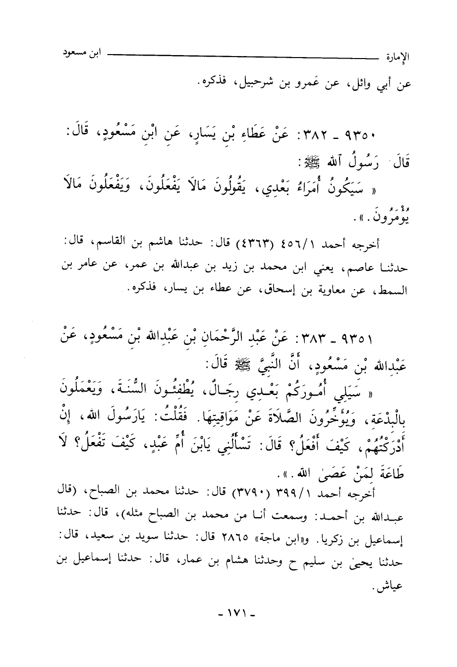 سَيَلِي أَمُورَكُمْ بَعْدِي، رِجَالٌ يُطْفِئُونَ السُّنَّةَ، وَيُحْدِثُونَ بِدْعَةً، وَيُؤَخِّرُونَ الصَّلَاةَ عَنْ مَوَاقِيتِهَا، قَالَ ابْنُ مَسْعُودٍ: يَا رَسُولَ اللهِ، كَيْفَ بِي إِذَا أَدْرَكْتُهُمْ؟ قَالَ: لَيْسَ يَا ابْنَ أُمِّ عَبْدٍ، طَاعَةٌ لِمَنْ عَصَى اللَّهَ. (