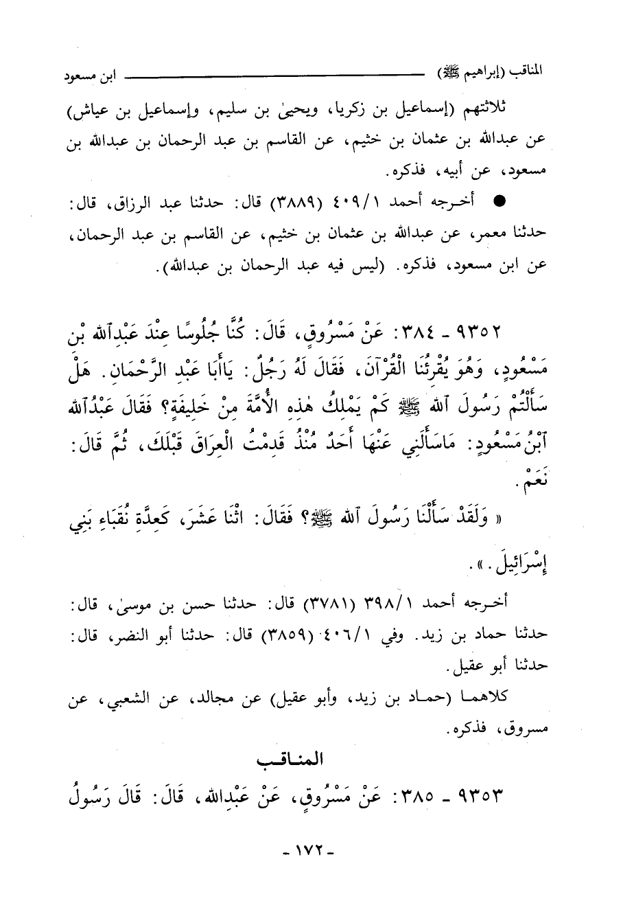 ٩٣٥٢ - عَنْ مَسْرُوقٍ، قَالَ: كُنَّا جُلُوسًا عِنْدَ عَبْدِ اللهِ بْنِ مَسْعُودٍ، وَهُوَ يُقْرِئُنَا الْقُرْانَ، فَقَالَ لَهُ رَجُلٌ: يَا أَبَا عَبْدِ الرَّحْمَانِ، هَلْ سَأَلْتُمْ رَسُولَ اللهِ صلى الله عليه وسلم: كَمْ يَمْلِكُ هَذِهِ الأُمَّةَ مِنْ خَلِيفَةٍ؟ فَقَالَ عَبْدُ اللهِ: مَاسَأَلَنِي عَنْهَا أَحَدٌ مُنْذُ قَدِمْتُ الْعِرَاقَ قَبْلَكَ، ثُمَّ قَالَ: نَعَمْ؛