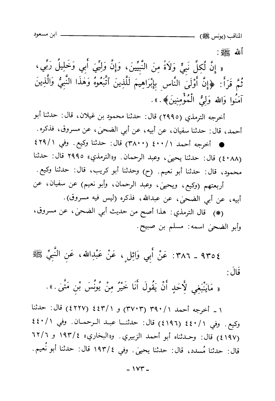 - وفي رواية: مَا يَنْبَغِي لأَحَدٍ، أَنْ يَكُونَ خَيْرًا، مِنِ ابْنِ مَتَّى. ٢.