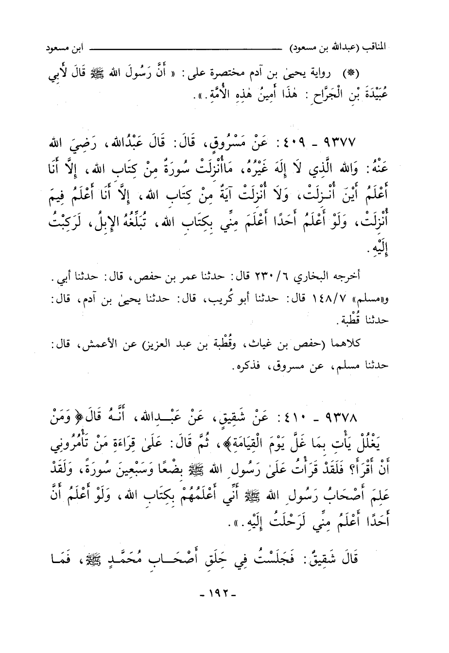 ٩٣٧٨ - عَنْ شَقِيقِ، عَنْ عَبْدِ اللهِ أَنَّهُ قَالَ: " وَمَنْ يَغْلُلْ يَأْتِ بِمَا غَلَّ يَوْمَ الْقِيَامَةِ)، ثُمَّ قَالَ: عَلَى قِرَاءَةِ مَنْ تَأْمُرُونِّي أَنْ أَقْرَأَ؟ فَلَقَدْ قَرَأْتُ عَلَى رَسُولِ اللهِ صلى الله عليه وسلم بِضْعًا وَسَبْعِينَ سُورَةً، وَلَقَدْ عَلِمَ أَصْحَابُ رَسُولِ الله صلى الله عليه وسلم أَنِّي أَعْلَمُهُمْ بِكِتَابِ اللهِ، وَلَوْ أَعْلَمُ أَنَّ أَحَدًا أَعْلَمُ مِنِّي لَرَحْلَتُ إِلَيْهِ، قَالَ شَقِيقٌ: فَجَلَسْتُ فِي حَِلَقِ أَصْحَابِ مُحَمَّدٍ صلى الله عليه وسلم، فَمَا