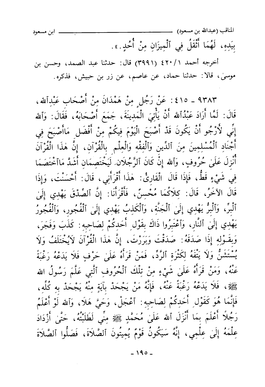 ٩٣٨٣ - عَنْ رَجُلٍ مِنْ هَمْدَانَ، مِنْ أَصْحَابِ عَبْداللهِ، قَالَ: لَمَّا أَرَادَ عَبْداللهِ أَنْ يَأْتِيَ الْمَدِينَةَ، جَمَعَ أَصْحَابَهُ، فَقَالَ: وَاللهِ، إِنِّي لأَرْجُو أَنْ يَكُونَ قَدْ أَصْبَحَ الْيَوْمَ فِيكُمْ مِنْ أَفْضَلِ مَا أَصْبَحَ فِي أَجْنَادِ الْمُسْلِمِينَ، مِنَ الدِّينِ، وَالْفِقْهِ، وَالْعِلْمِ بِالْقُرْآنِ،