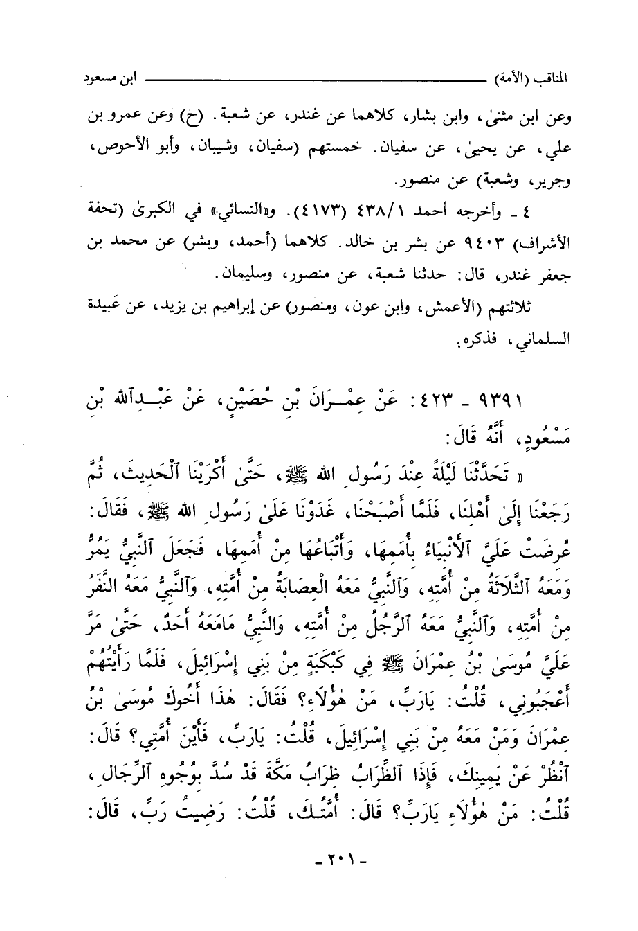 وحدَّثنا محمد بن المثنى، وابن بشار، قالا: حدَّثنا محمد بن جعفر، حدَّثنا شُعبة (ح) وحدَّثنا محمد بن المثنى، وابن بشار، قالا: حدَّثنا عبد الرحمن، حدَّثنا سفيان، كلاهما عن منصور. وفي (٦٥٦٣) قال: حدثني الحسن بن علي الحلواني، حدَّثنا أزهر بن سعد السمان، عن ابن عون. و) اابن ماجة (٢٣٦٢ قال: حدَّثنا عثمان بن أبي شيبة، وعَمْرو بن رافع، قالا: حدَّثنا جرير، عن منصور. و"التِّرمِذي" ٣٨٥٩ قال: حدَّثني هناد، حدَّثنا أبو معاوية، عن الأعمش. و"النَّسائي" في "الكبرى"٥٩٨٧ قال: أَخْبَرنا إسحاق بن إبراهيم، قال: أَخْبَرنا جرير، عن منصور. وفي (٥٩٨٨/ ١) قال: أَخْبَرنا أحمد بن عثمان، قال: حدَّثنا أزهر، قال: حدَّثنا ابن عون. وفي (٥٩٨٨/ ٢) قال: أَخْبَرنا محمد بن بشار، ومحمد بن المثنى، قالا: حدَّثنا محمد، قال: حدَّثنا شُعبة، عن منصور. وفي