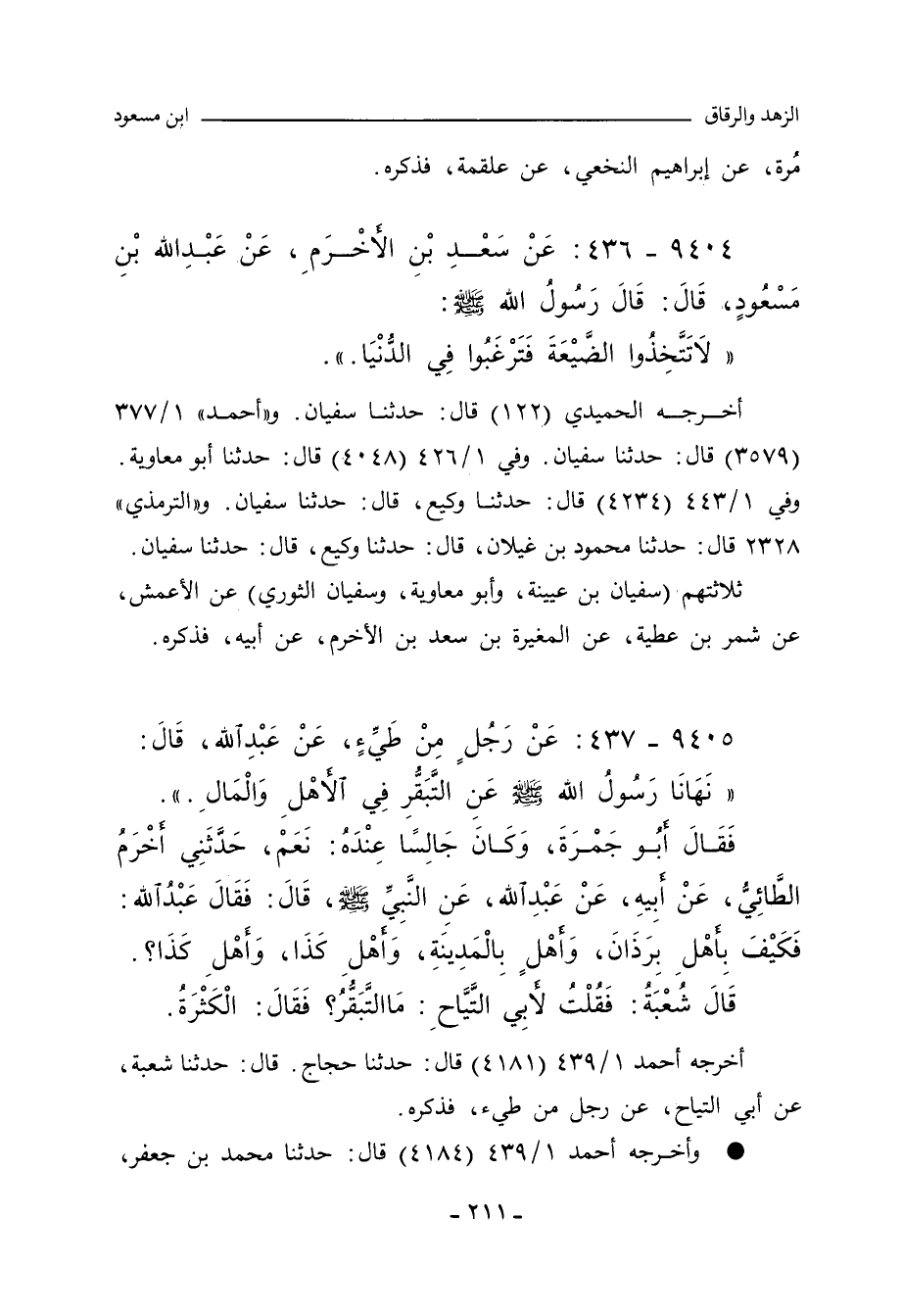 ٩٤٠٤ - عَنْ سَعْدِ بْنِ الأَخْرَمِ، عَنْ عَبْدِ اللهِ بْنِ مَسْعُودٍ، قَالَ: قَالَ رَسُولُ اللهِ صلى الله عليه وسلم: