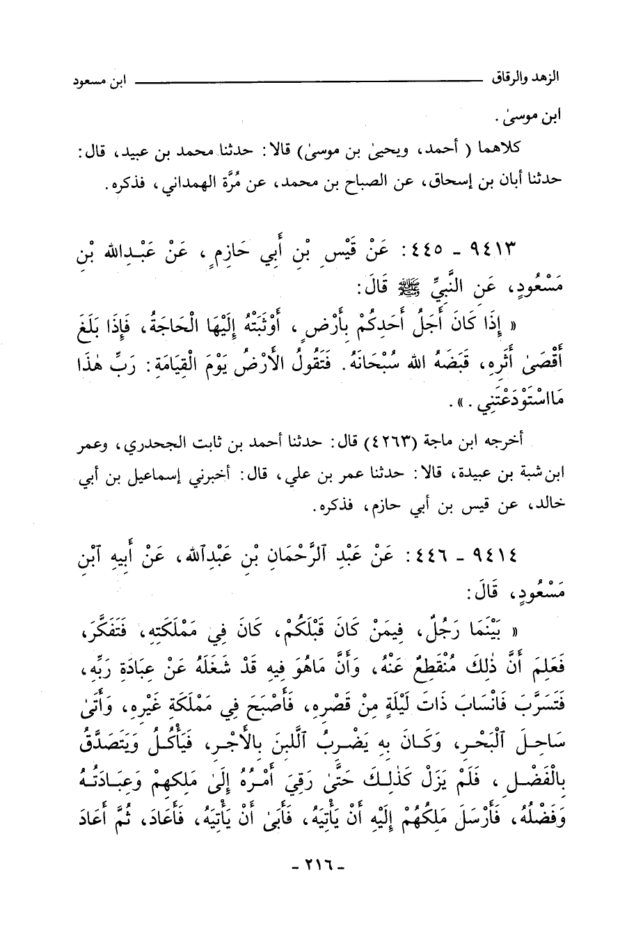 ٩٤١٣ - عَنْ قَيْسِ بْنِ أَبِي حَازِمٍ، عَنْ عَبْدِ اللهِ بْنِ مَسْعُودٍ، عَنِ النَّبِيِّ صلى الله عليه وسلم، قَالَ: