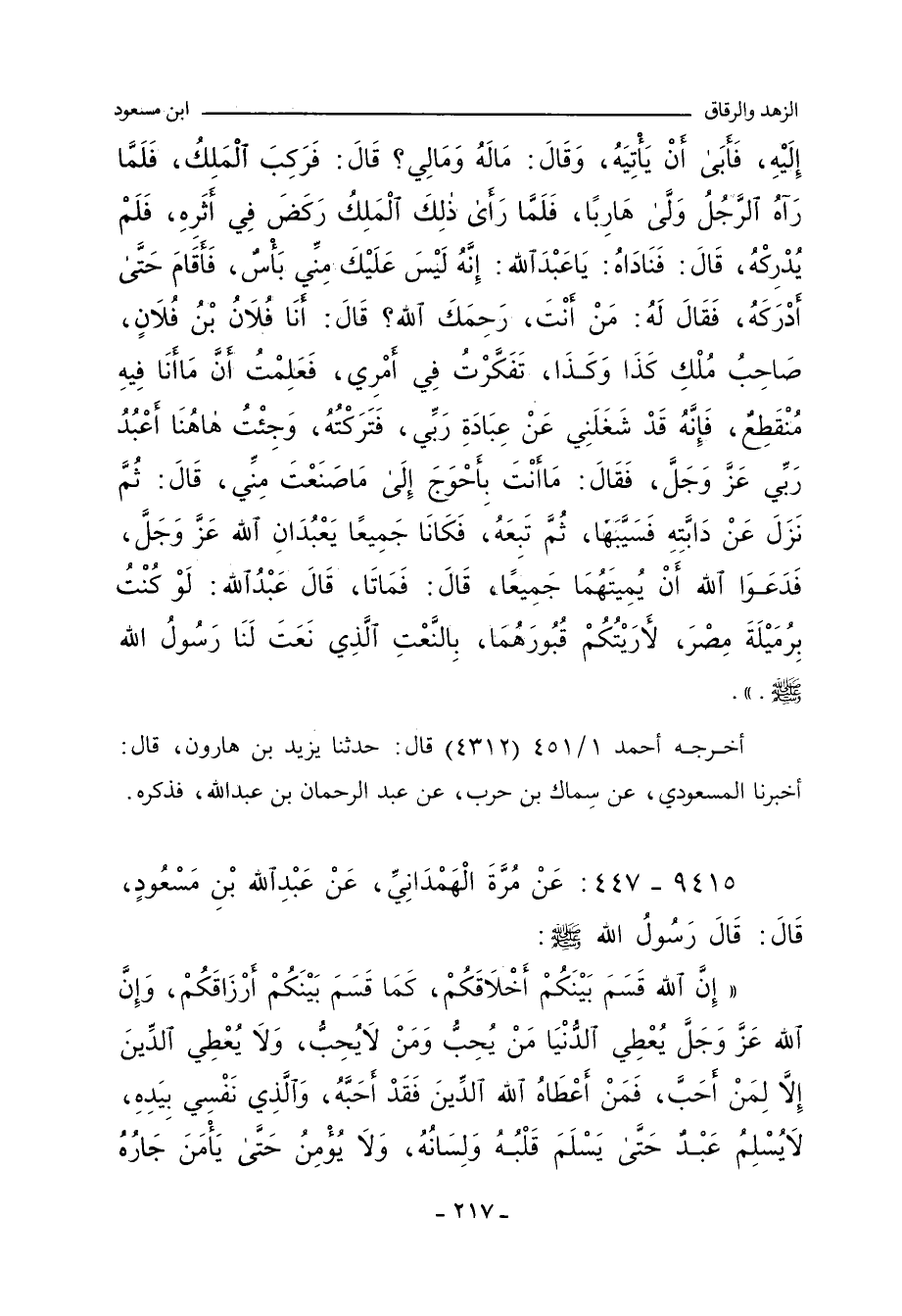 إِلَيْهِ , فَأَبَى أَنْ يَأْتِيَهُ , وَقَالَ: مَالَهُ وَمَالِي؟ قَالَ: فَرَكِبَ الْمَلِكُ , فَلَمَّا رَآهُ الرَّجُلُ وَلَّى هَارِبًا , فَلَمَّا رَأَى ذَلِكَ الْمَلِكُ رَكَضَ فِي أَثَرِهِ، فَلَمْ يُدْرِكْهُ , قَالَ: فَنَادَاهُ: يَا عَبْدَ اللهِ، إِنَّهُ لَيْسَ عَلَيْكَ مِنِّي بَأْسٌ، فَأَقَامَ حَتَّى أَدْرَكَهُ , فَقَالَ لَهُ: مَنْ أَنْتَ , رَحِمَكَ اللَّهُ؟ قَالَ: أَنَا فُلَانُ بْنُ فُلَانٍ , صَاحِبُ مُلْكِ كَذَا وَكَذَا , تَفَكَّرْتُ فِي أَمْرِي , فَعَلِمْتُ أَنَّ مَا أَنَا فِيهِ مُنْقَطِعٌ , فَإِنَّهُ قَدْ شَغَلَنِي عَنْ عِبَادَةِ رَبِّي , فَتَرَكْتُهُ , وَجِئْتُ هَاهُنَا أَعْبُدُ رَبِّي , عَزَّ وَجَلَّ , فَقَالَ: مَا أَنْتَ بِأَحْوَجَ إِلَي مَا صَنَعْتَ مِنِّي , قَالَ: ثُمَّ نَزَلَ عَنْ دَابَّتِهِ فَسَيَّبَهَا , ثُمَّ تَبِعَهُ , فَكَانَا جَمِيعًا يَعْبُدَانِ اللَّهَ، عَزَّ وَجَلَّ، فَدَعَوَا اللَّهَ أَنْ يُمِيتَهُمَا جَمِيعًا , قَالَ: فَمَاتَا , قَالَ عَبْدُ اللهِ: لَوْ كُنْتُ بِرُمَيْلَةَ