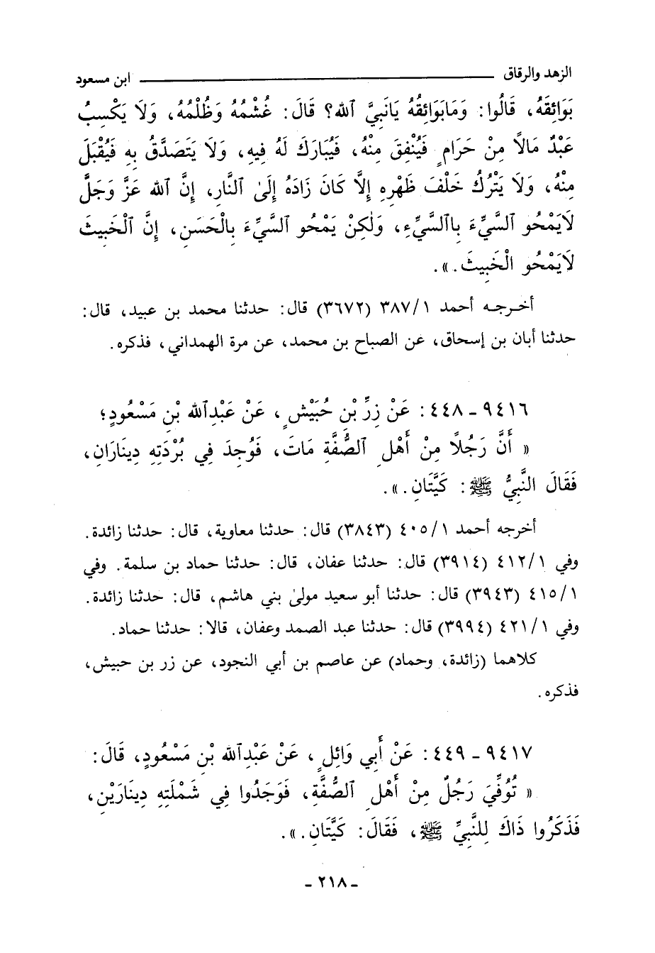 ٩٤١٦ - عَنْ زِرِّ بْنِ حُبَيْشٍ، عَنْ عَبْدِ اللهِ بْنِ مَسْعُودٍ؛